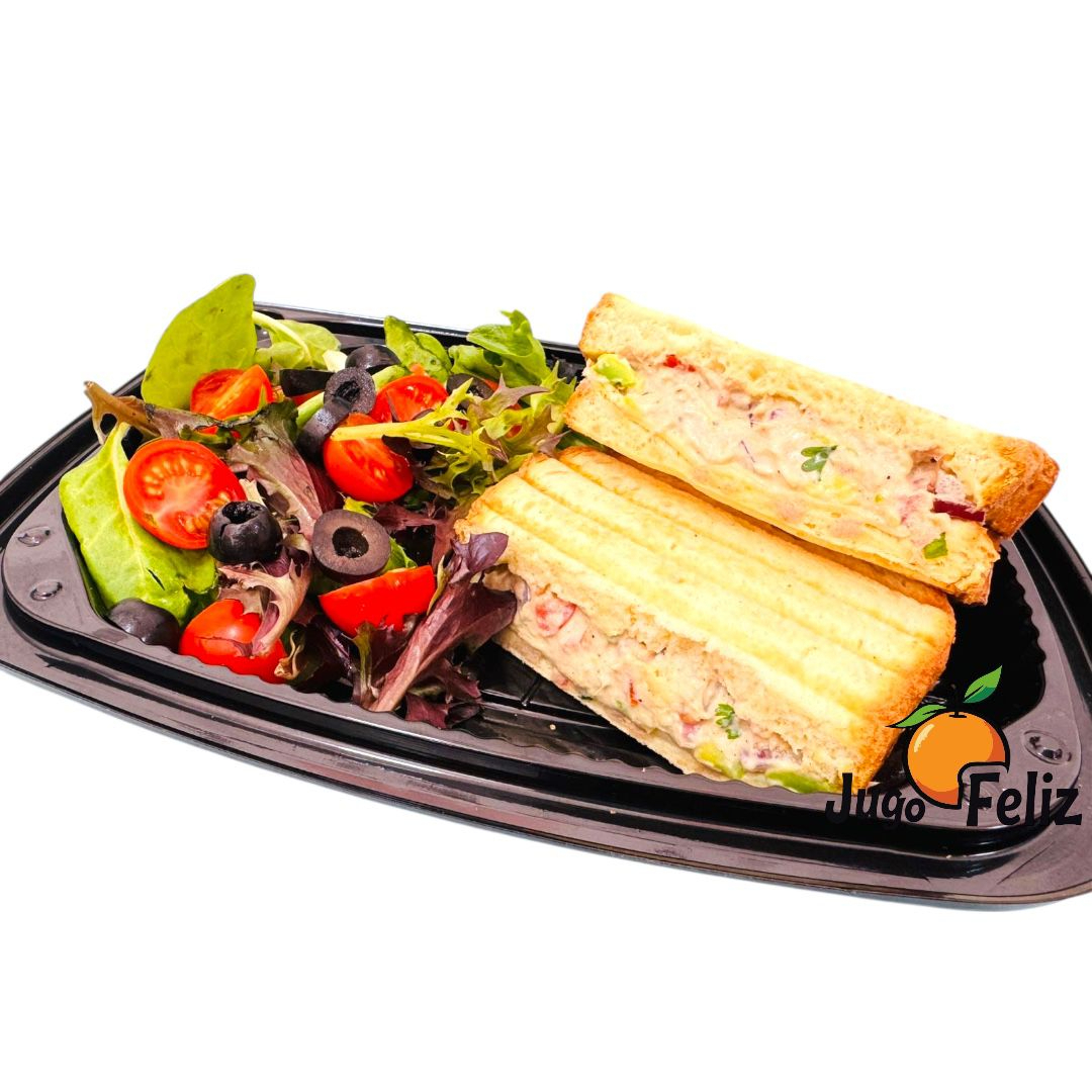 Delicioso sándwich con proteina de atún y aguacate, acompañado de porción de ensalada fresca mediterranea