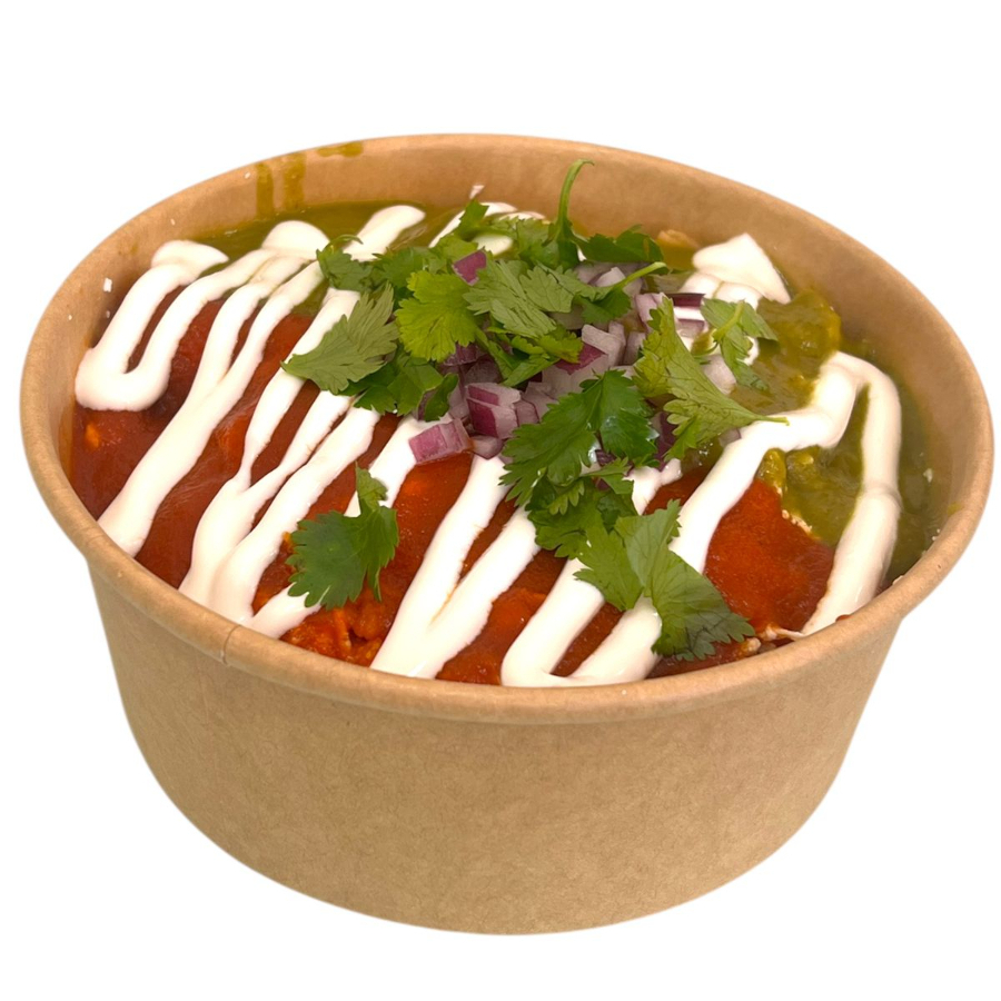 Totopos de maiz bañados en salsa verde y roja, servidos con pollo, queso y crema, acompalados de cebolla y cilantro