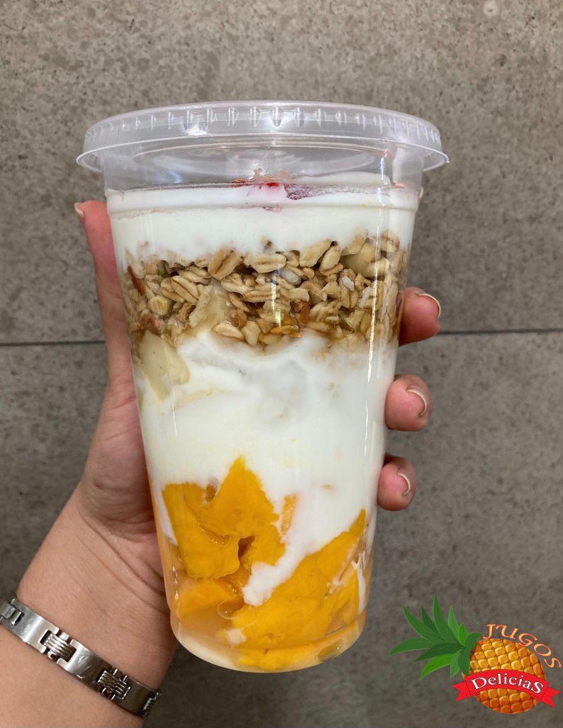 Plátano, mango, uva o fresa, yoghurt y granola.