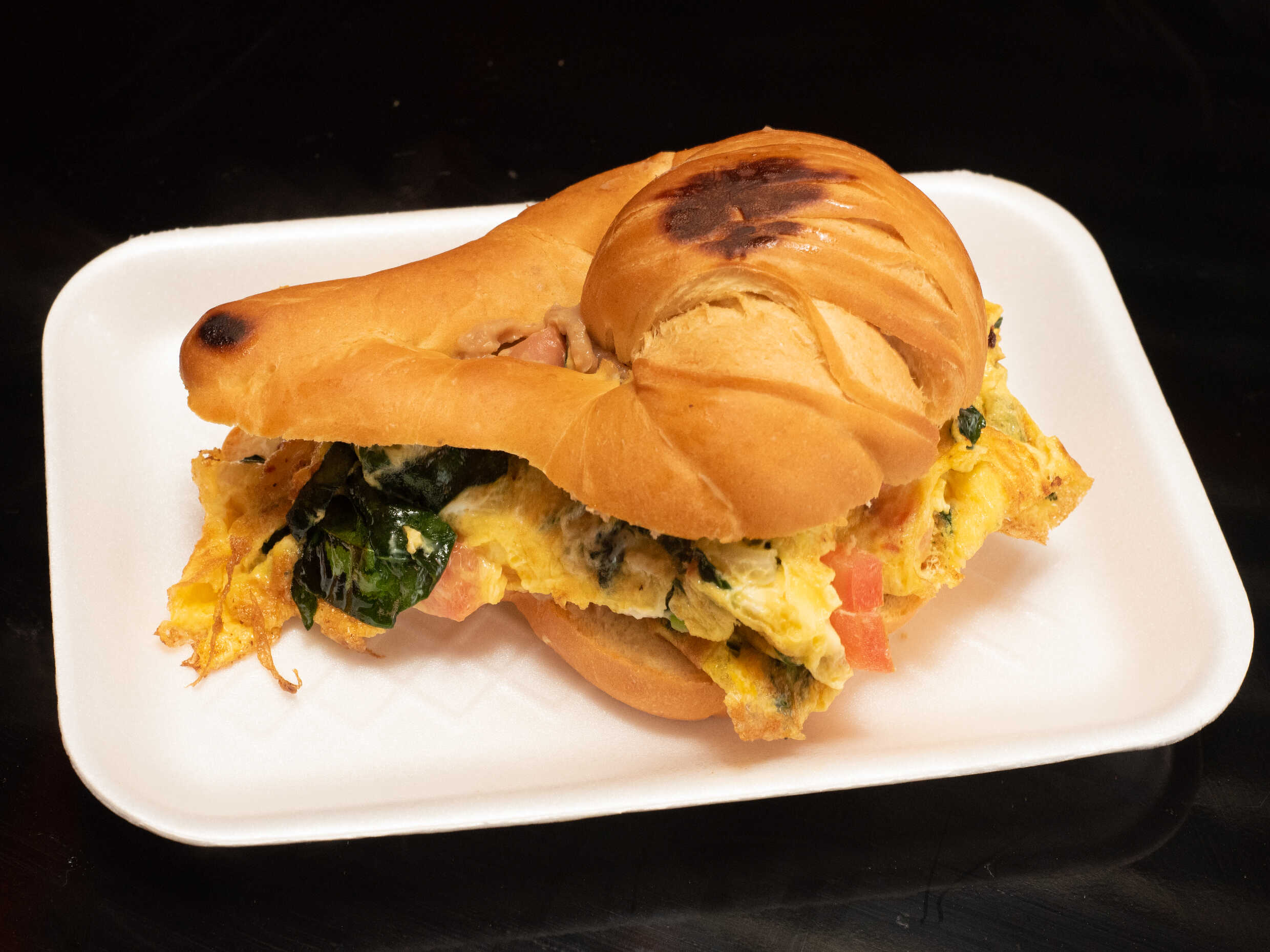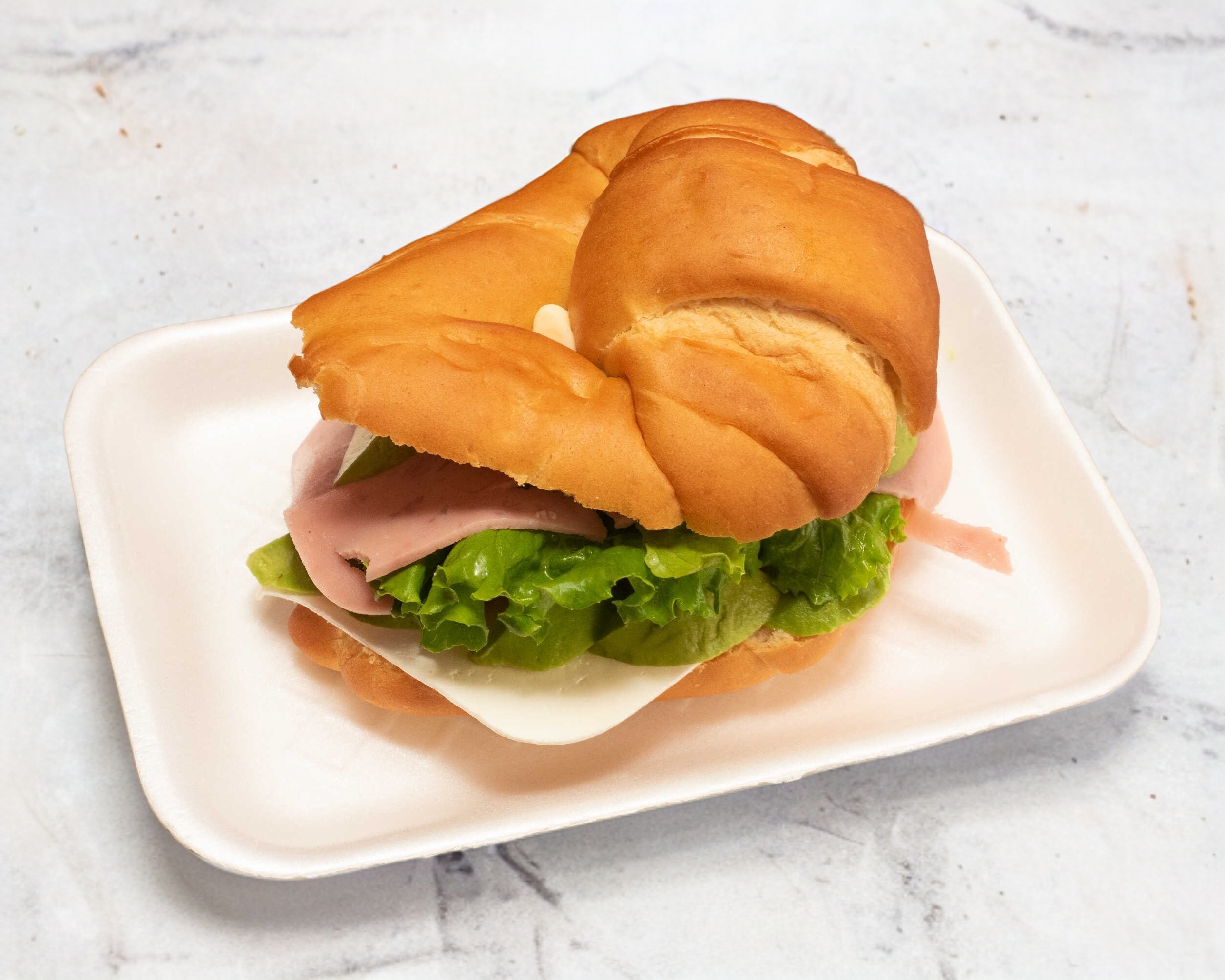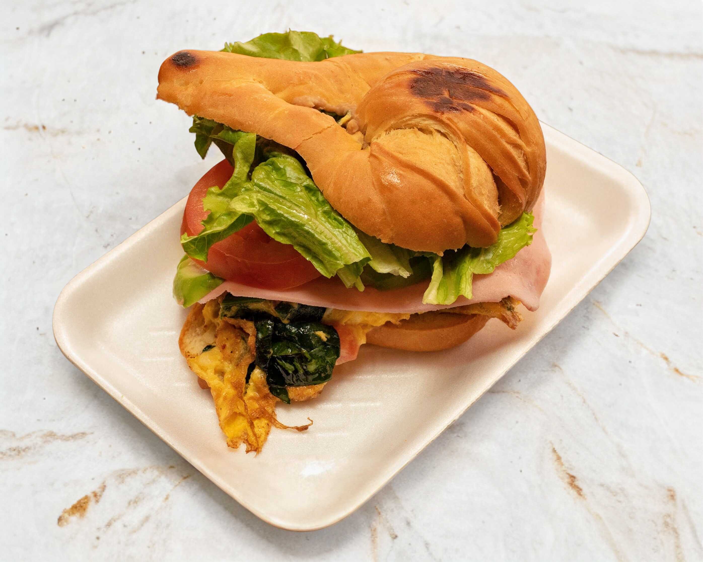Delicioso cuernito de huevo con jamón, queso y aguacate.