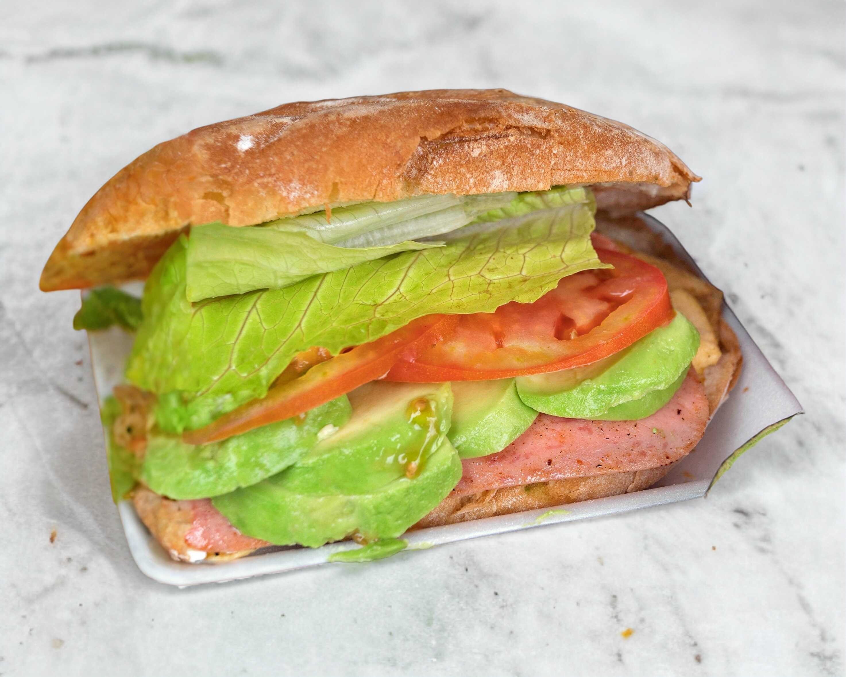 Queso panela, jamón de pavo, aguacate, tomate, lechuga y mayonesa.