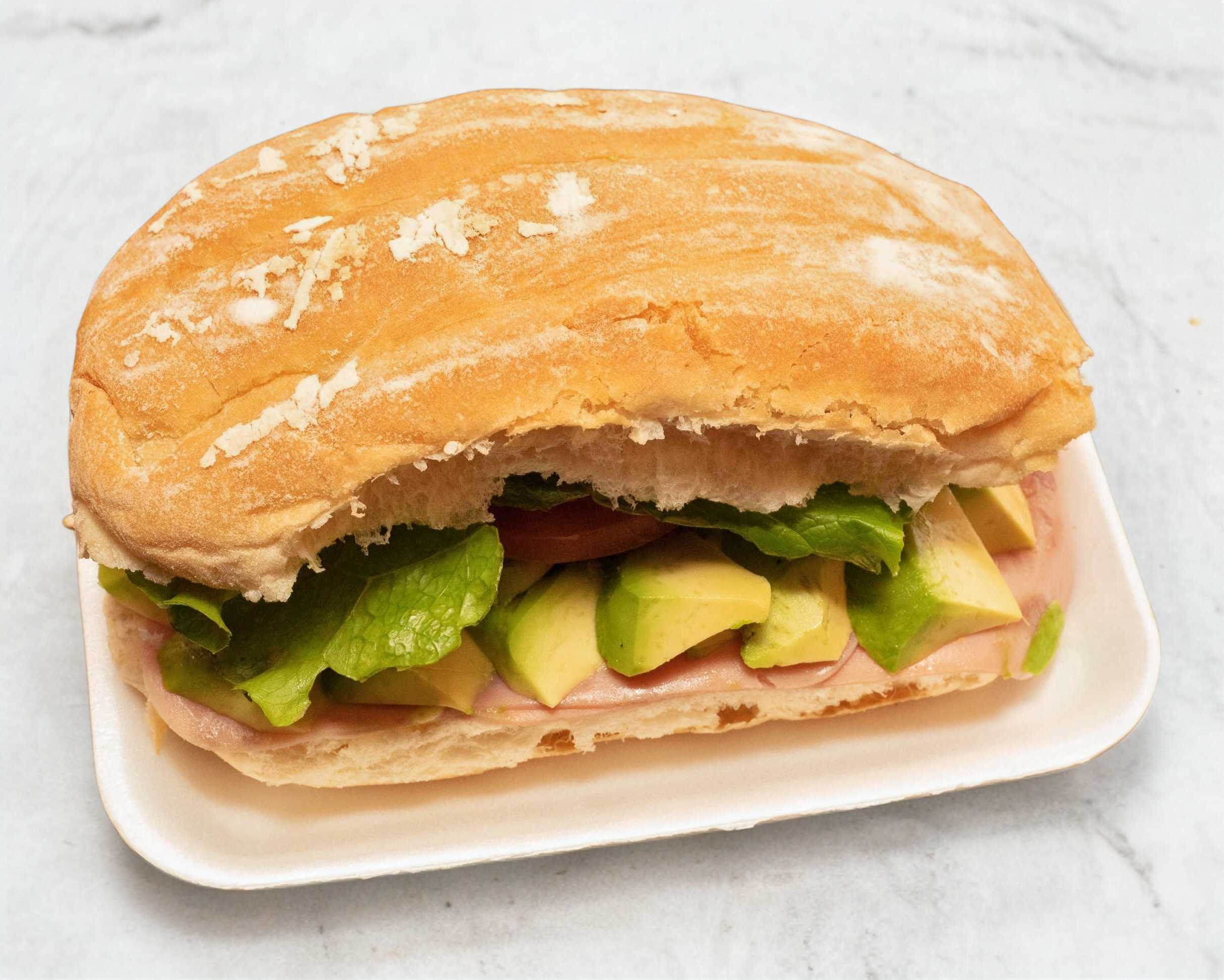 Jamón de pavo, panela, aguacate, lechuga tomate y mayonesa.
