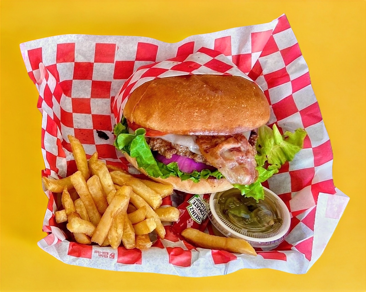 120 g Carne, queso gouda, tocino, lechuga, tomate, cebolla, mayonesa y cátsup, acompañada de 150 g de papas fritas.