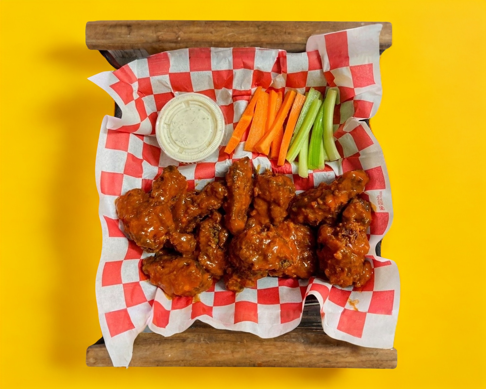 500 gr de alitas (peso en crudo) bañadas en tu salsa favorita, acompañadas de apio, zanahoria y aderezo ranch.
