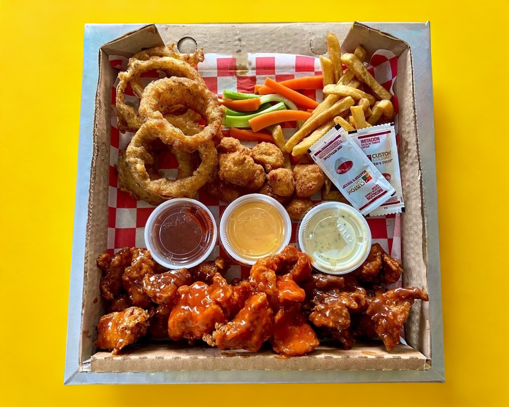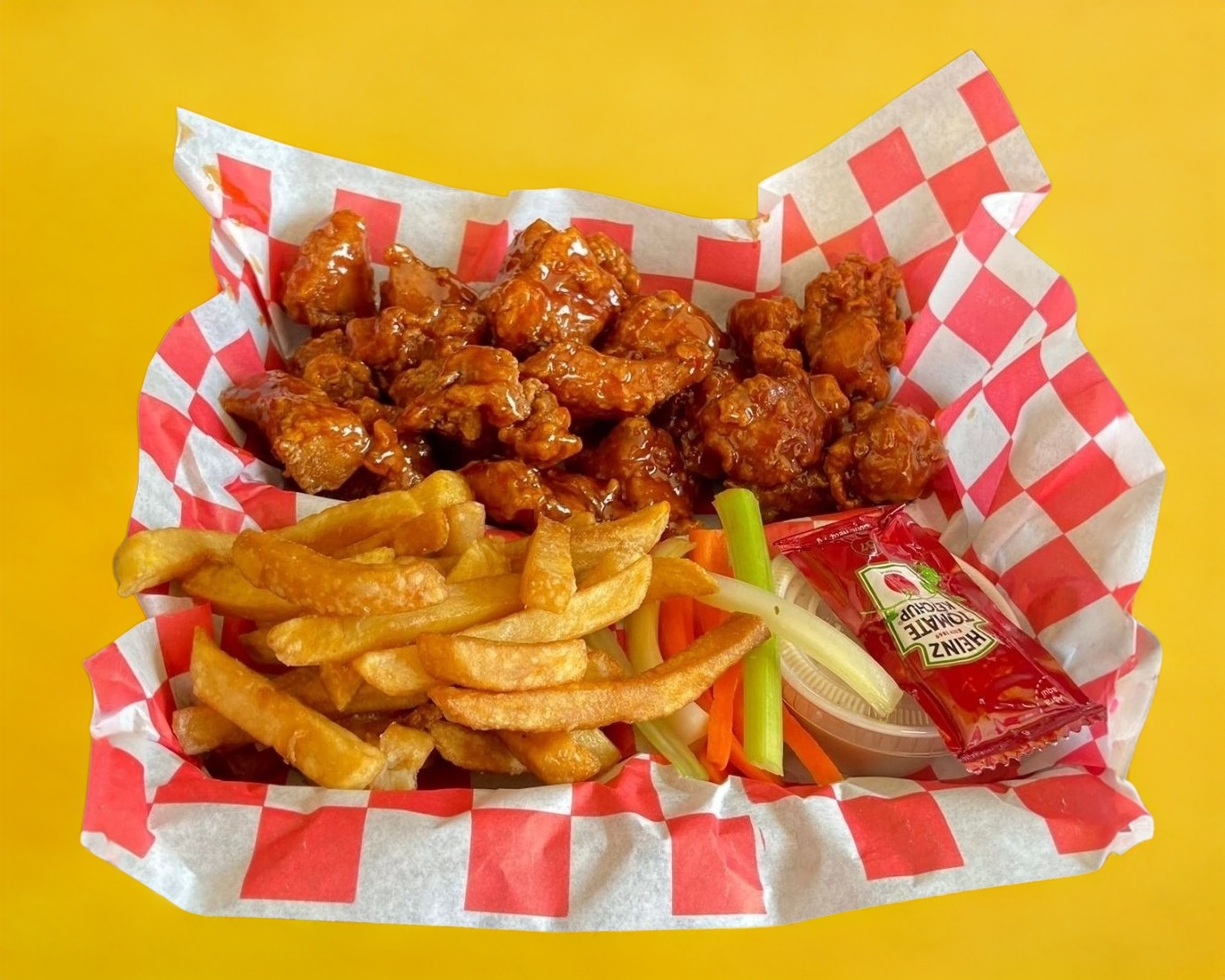 8-9 Boneless bañados con tu salsa favorita, 150 g de papas fritas, aderezo ranch, apio y zanahoria.