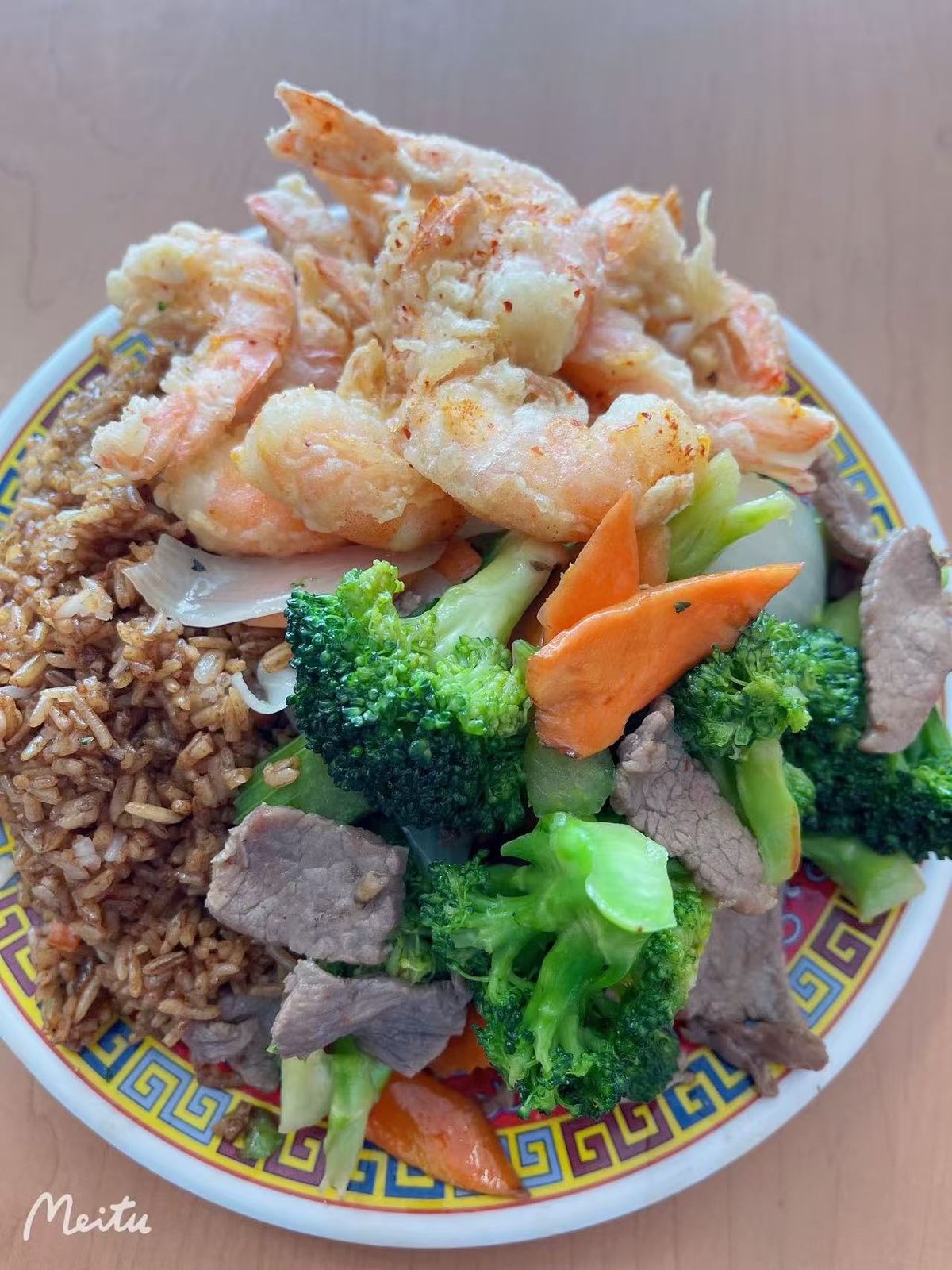 Camarón enchilado con 1 guisos a escoger, arroz frito, spaghetti o mixto.