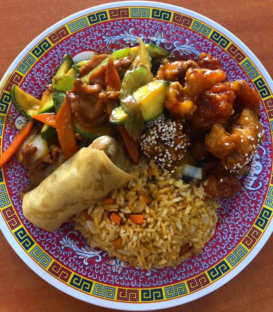 Camarón enchilado, 2 guisos a escoger, arroz frito, spaghetti o mixto.