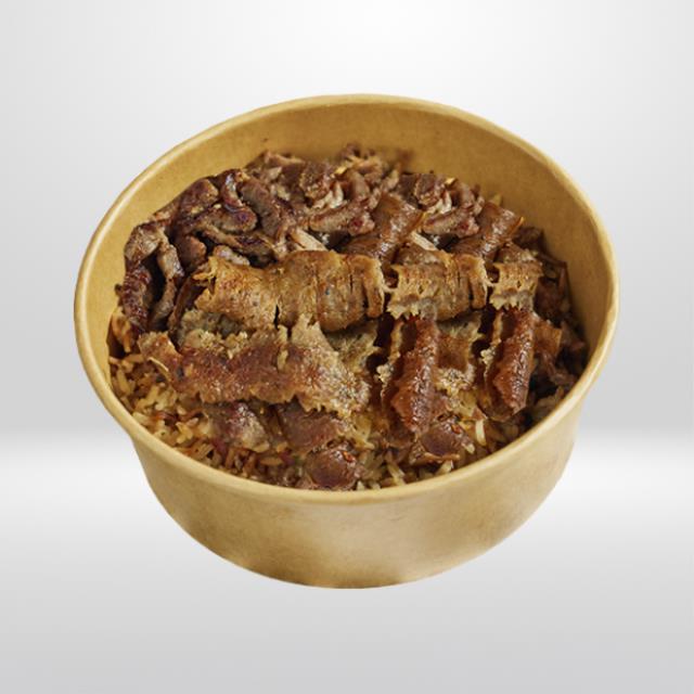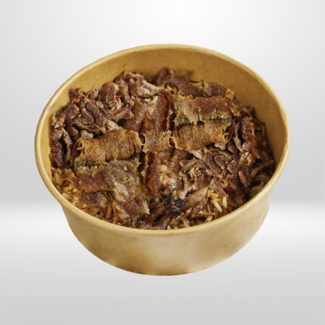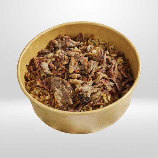 JUGOSA CARNE DE CORDERO Y TOP SIRLOIN SOBRE UNA MONTAÑA DE ARROZ GRIEGO