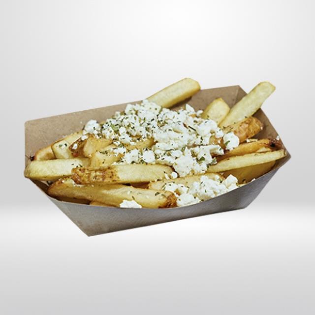 CRUJIENTES PAPAS A LA FRANCESA CON DELICIOSO QUESO FETA CONDIMENTADAS CON FINAS HIERBAS.
