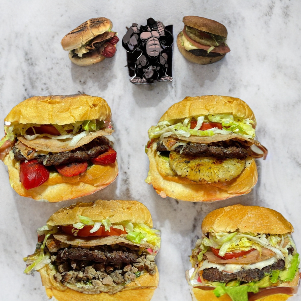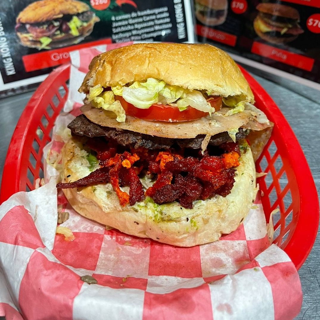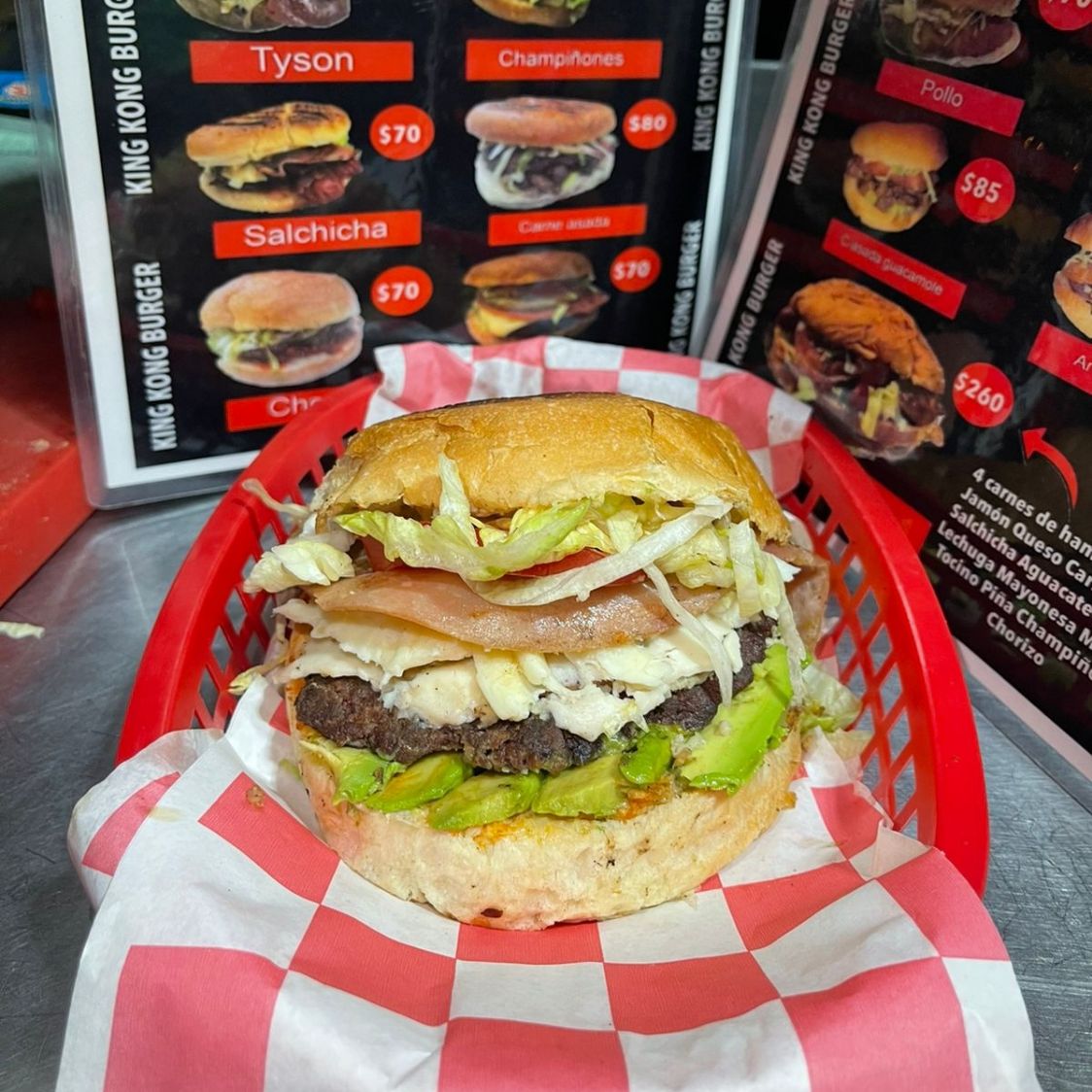 Doble carne de hamburguesa, doble queso, doble jamón, salchicha, tomate, aguacate, lechuga, mayonesa y mostaza.