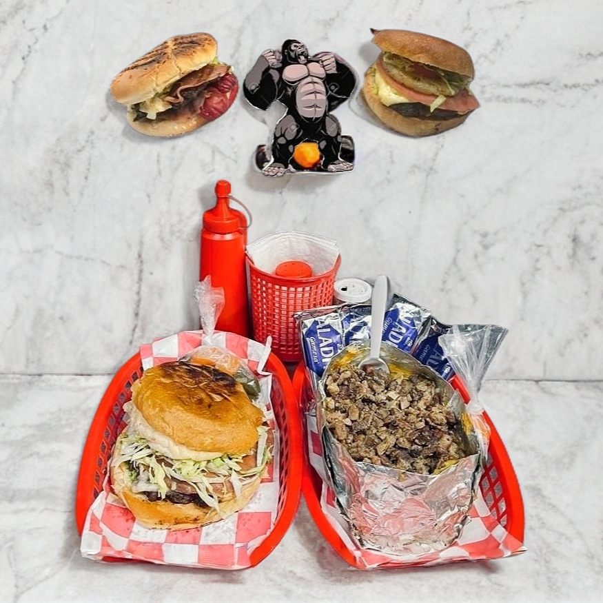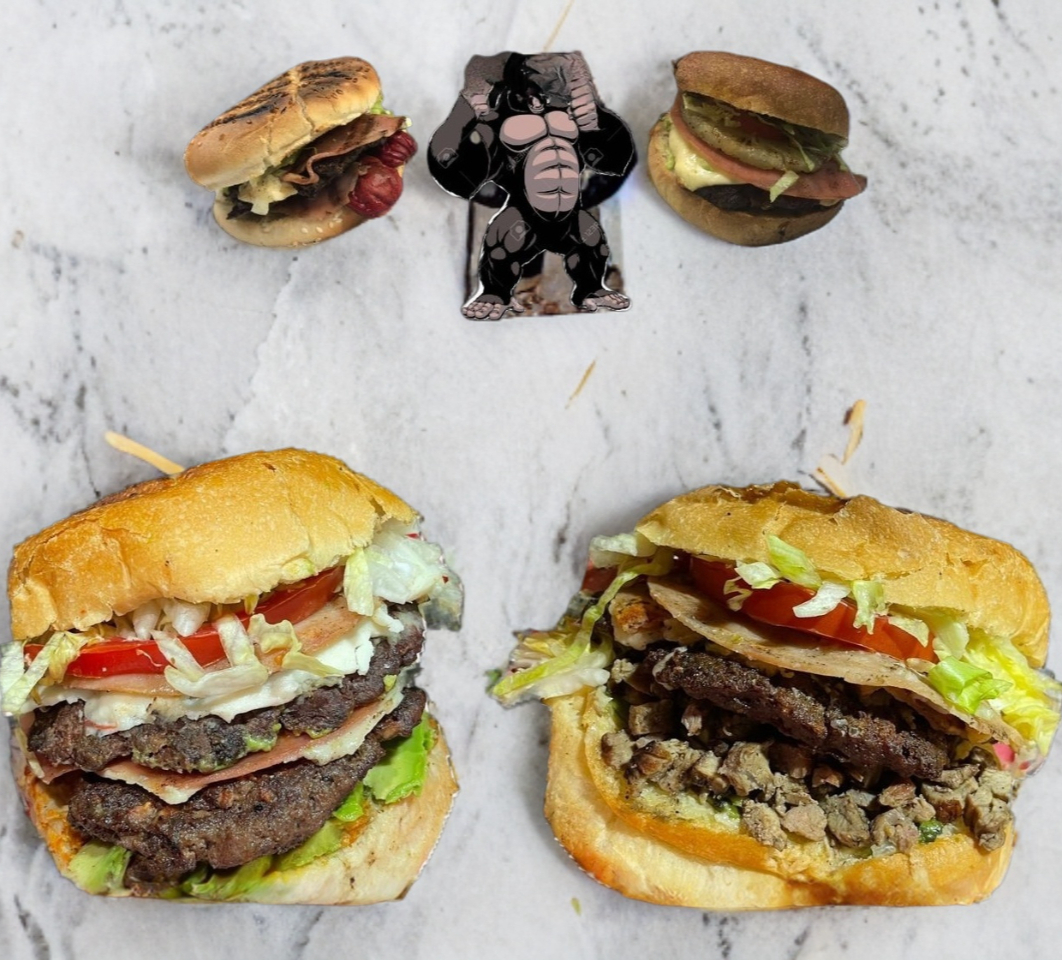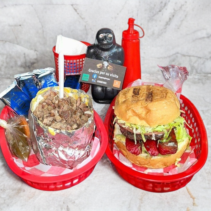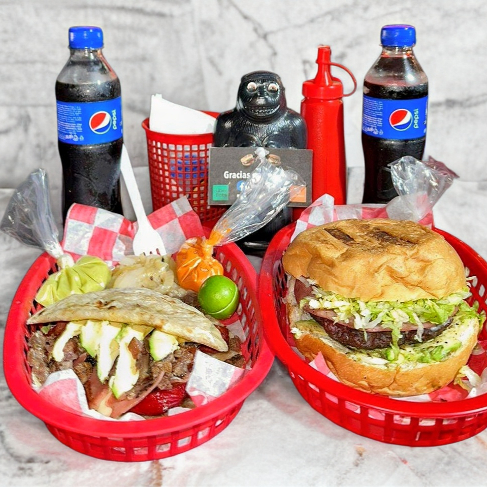 Doble carne de hamburguesa, doble queso, doble jamón, salchicha, tomate, aguacate, lechuga, mayonesa y mostaza.