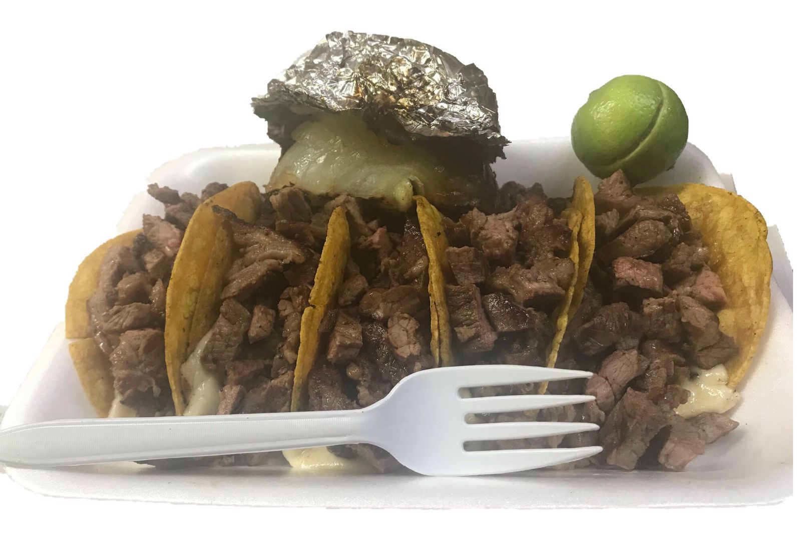 Tortilla de maíz, carne asada, queso, cebolla asada, limón y salsa.