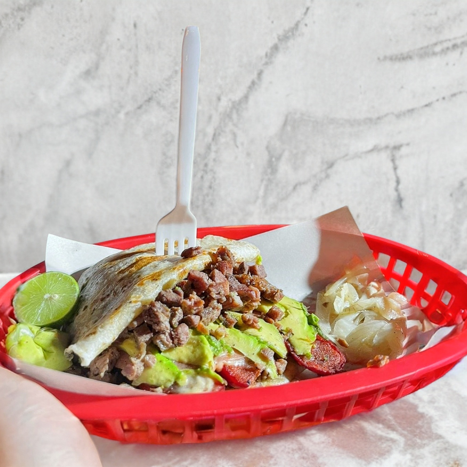 Carne asada, tortilla de harina, queso, aguacate, cebolla asada, limón y salsa.