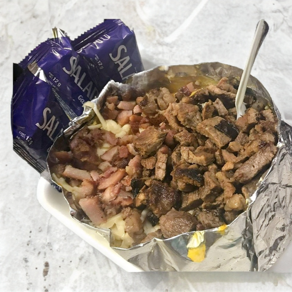 Papa, queso blanco, queso amarillo, mantequilla, un toque de crema, carne asada y tocino.