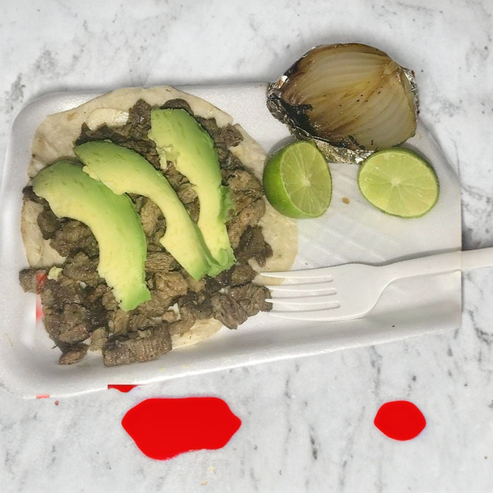 Tortilla de maíz, carne asada, tocino, queso, cebolla asada, limón y salsa.