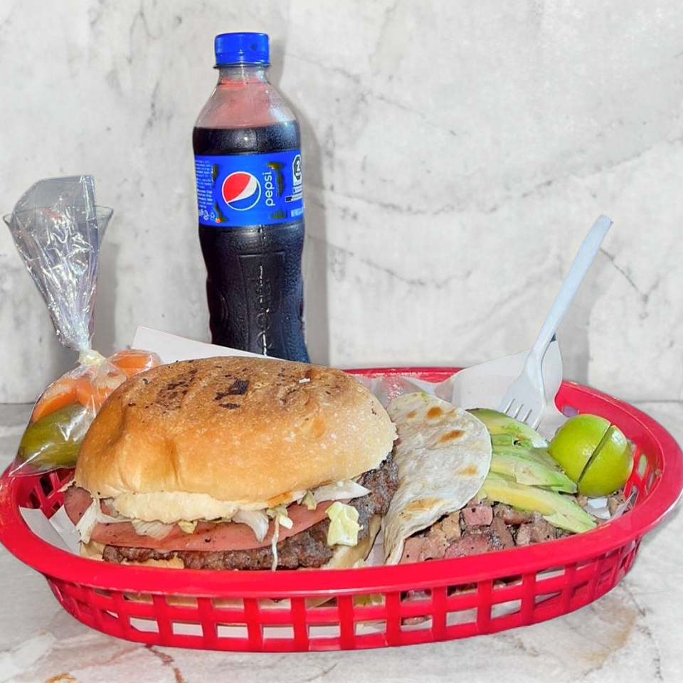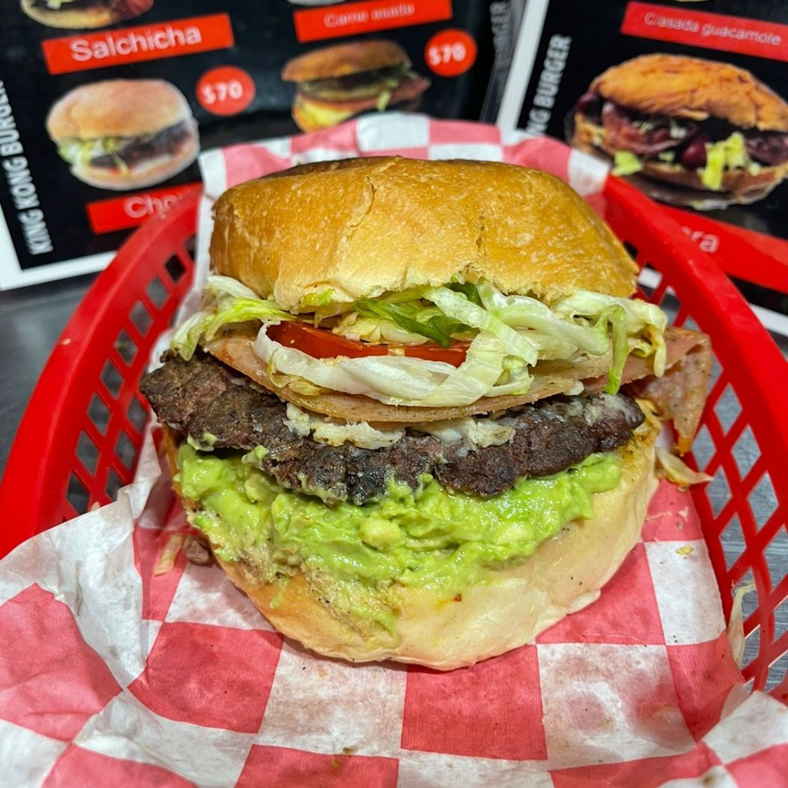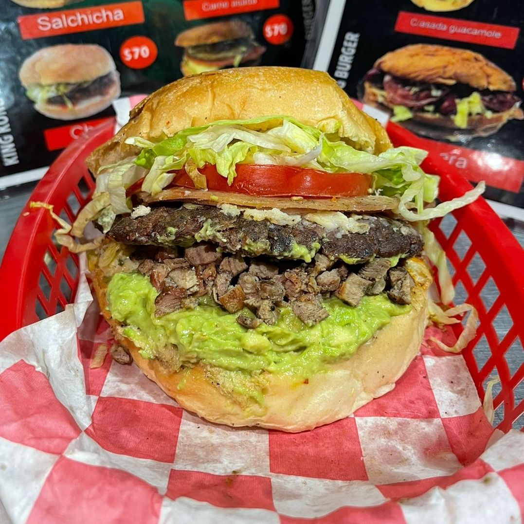 Carne de hamburguesa, doble queso blanco, jamón, lechuga, tomate, aguacate, mayonesa y mostaza.