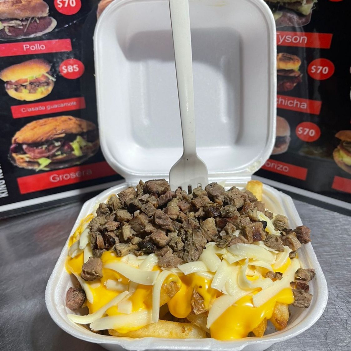 Preparada con: carne asada, queso amarillo y queso blanco.