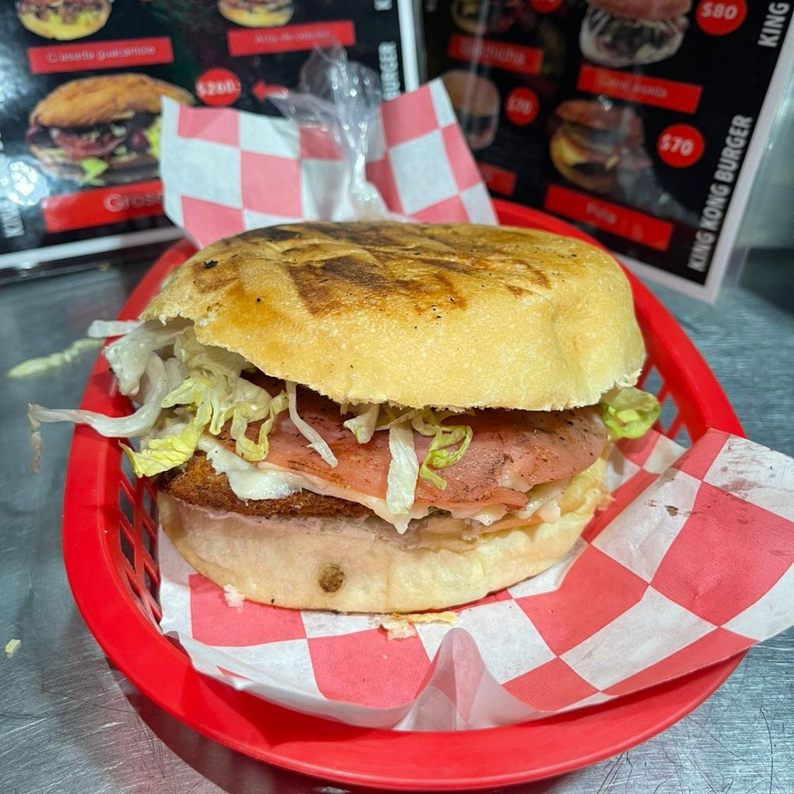 Carne de hamburguesa, pechuga de pollo empanizada, queso, jamón, lechuga, tomate, aguacate, mayonesa y mostaza.