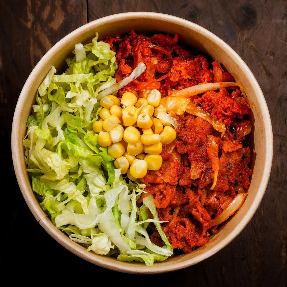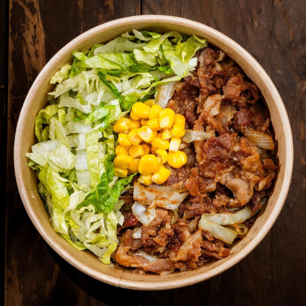 Cerdo salteado al estilo coreano con arroz y verduras frescas (cebolla y repollo). Salsa hecha con gochujang, la icónica pasta de chile de Corea.