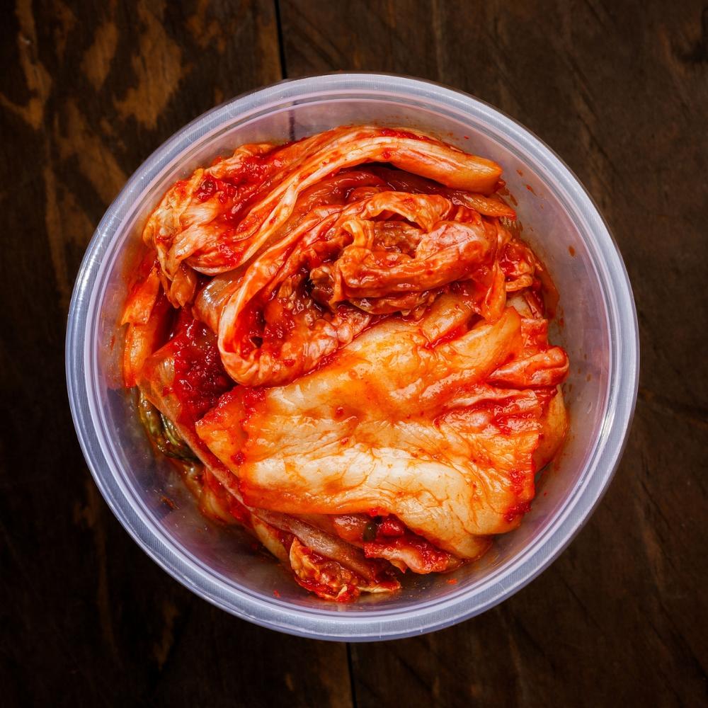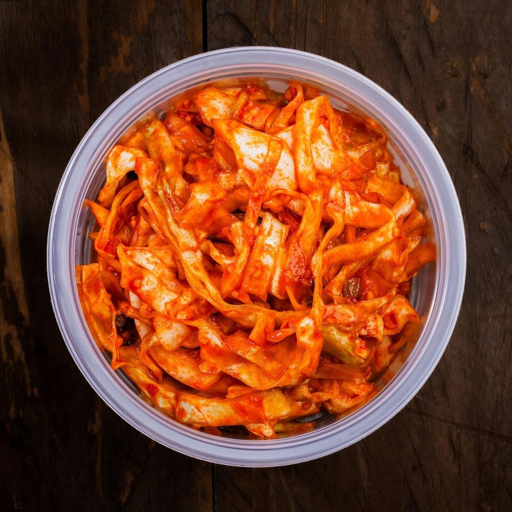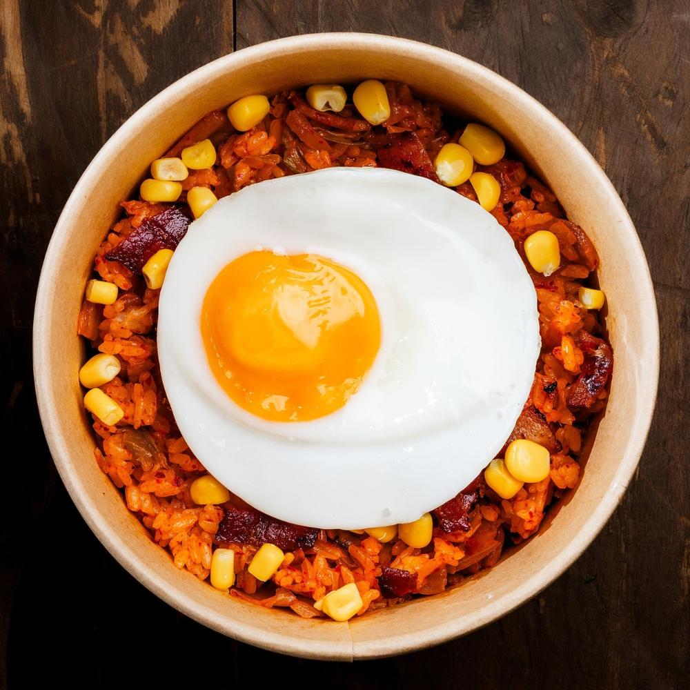 Arroz salteado con kimchi fermentado, cebolla, tocino y chile en polvo. Sabor ligeramente picante y sabroso.
