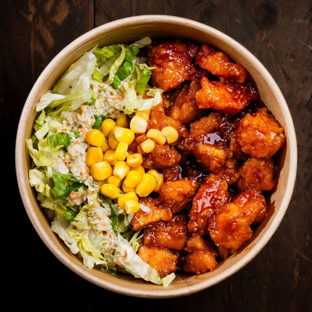 Arroz con pollo frito crujiente, salsa Korean BBQ y un toque de mayonesa de jalapeño.