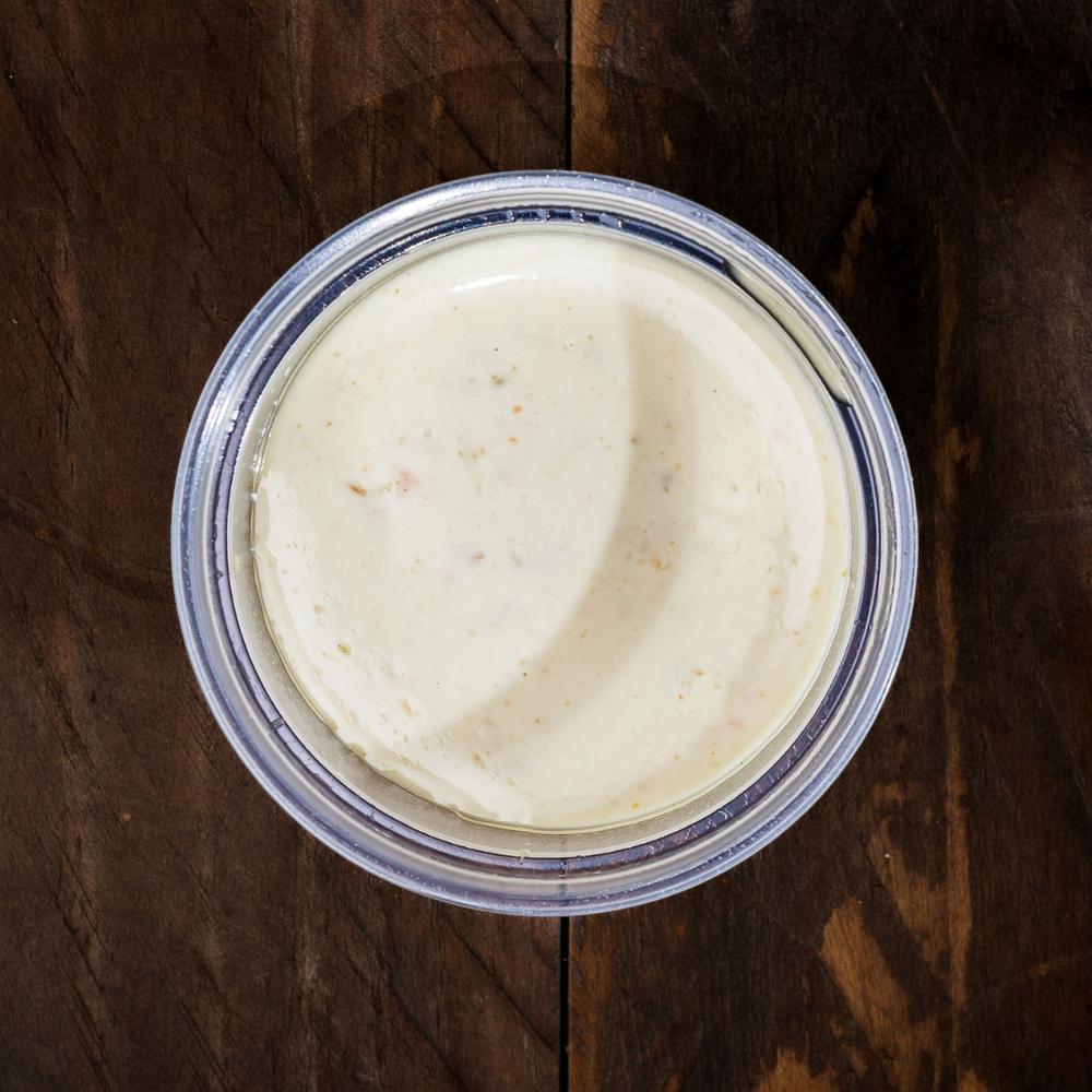A base de jalapeño y mayonesa; ligeramente picante, ácido y dulce.