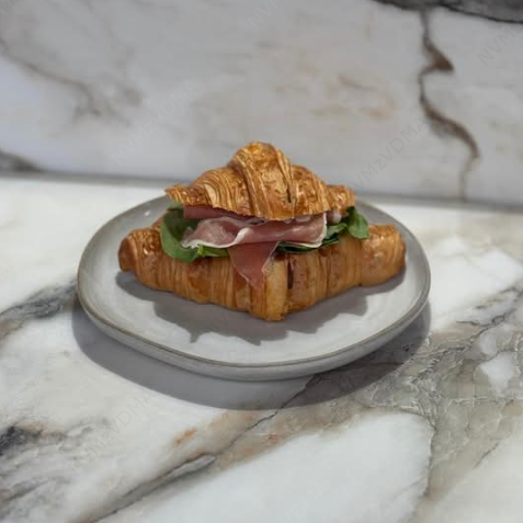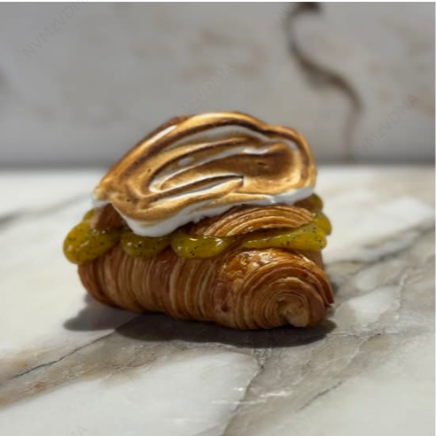 Croissant relleno de ganache de chocolate cubierto con chocolate y crunch.