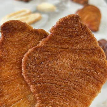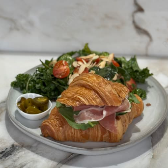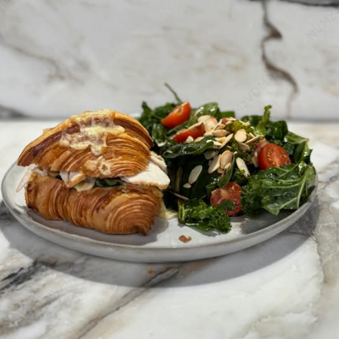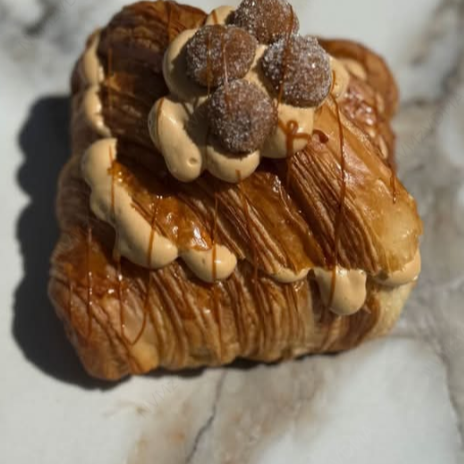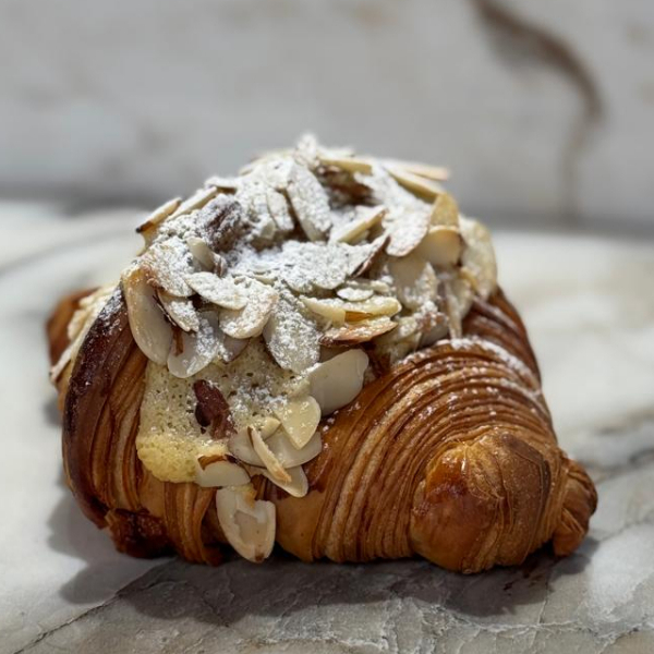 Croissant cubierto con pasta de almendra y almendra fileteada tostada.