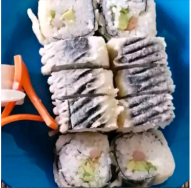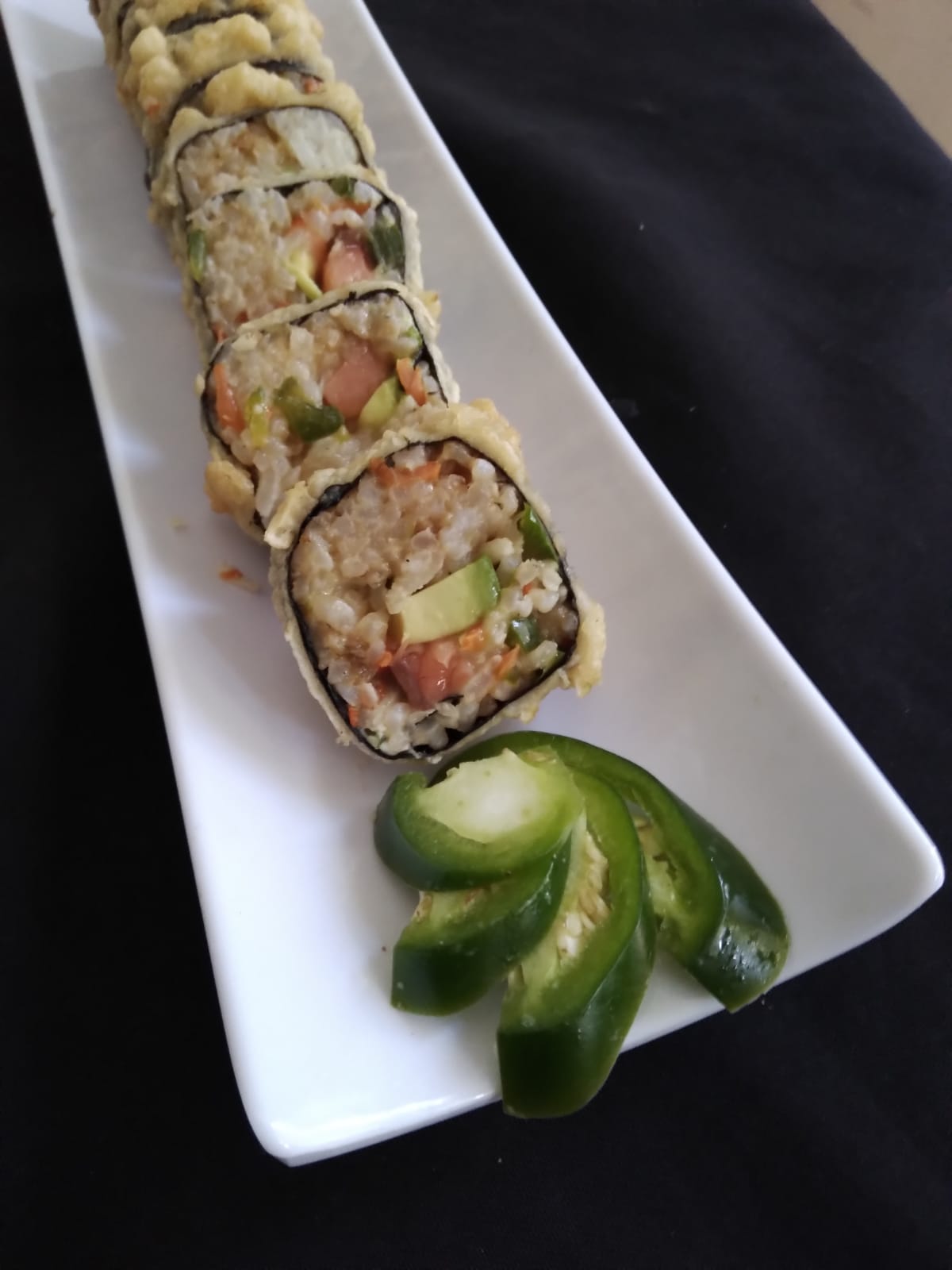 Arroz frito, pollo empanizado, aguacate, chipotle, cebollín, queso Philadelphia y chipotle.