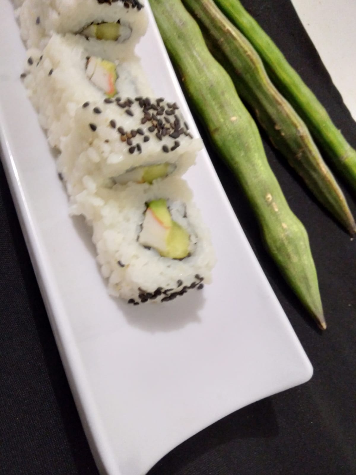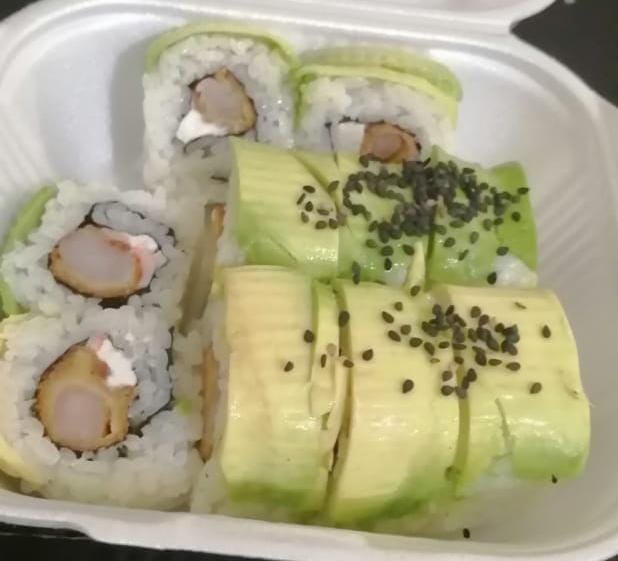 Rollo relleno de camarón empanizado con queso y tampico cubierta de aguacate.