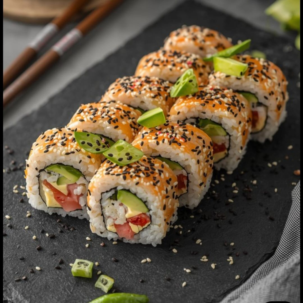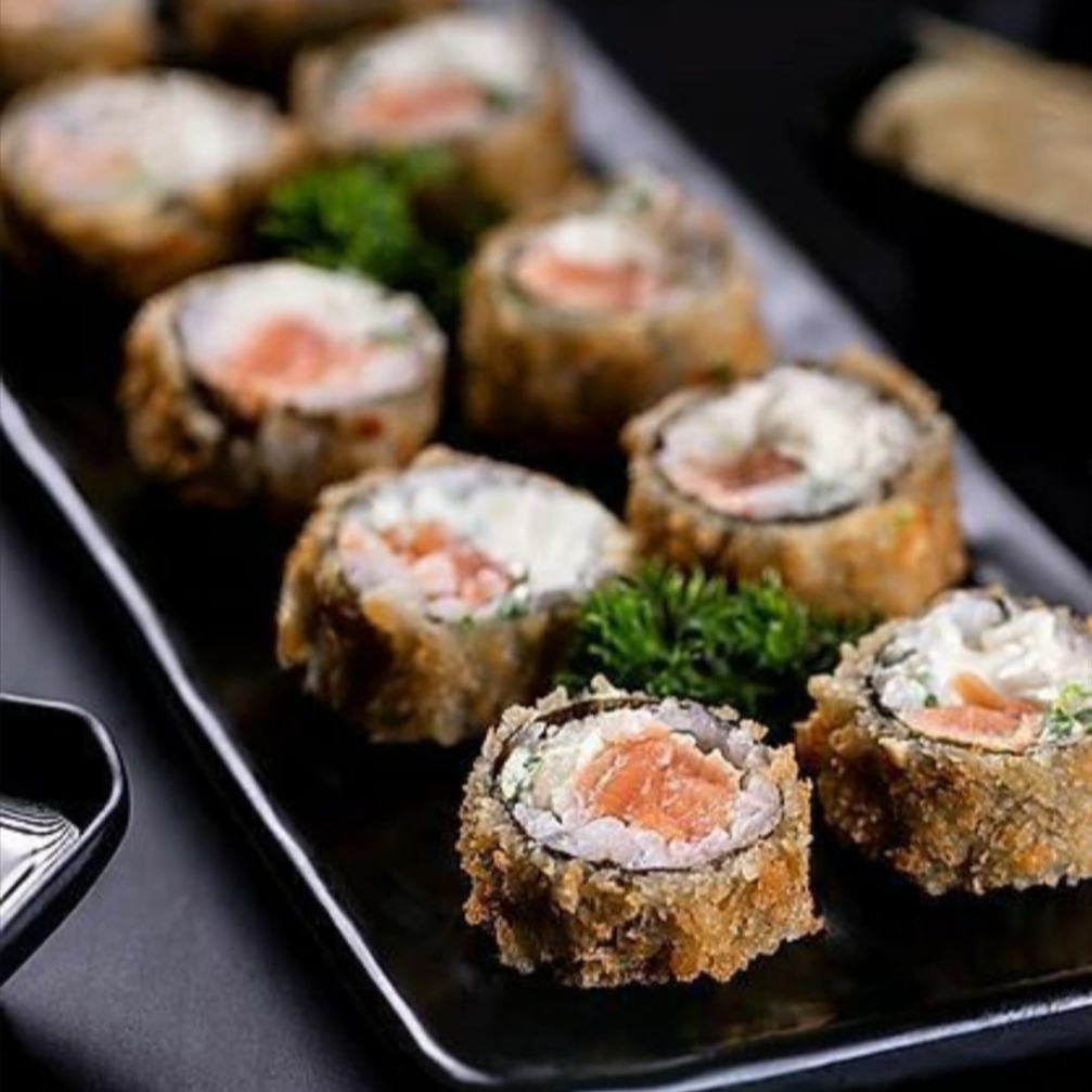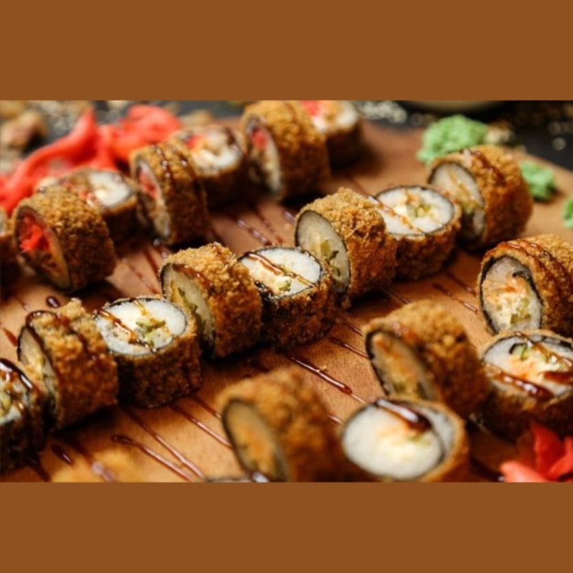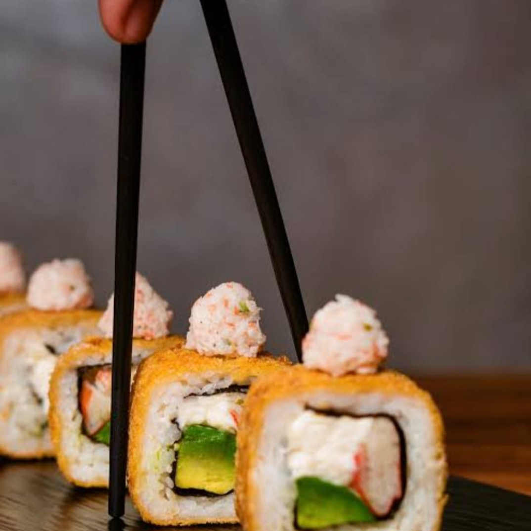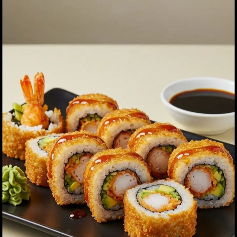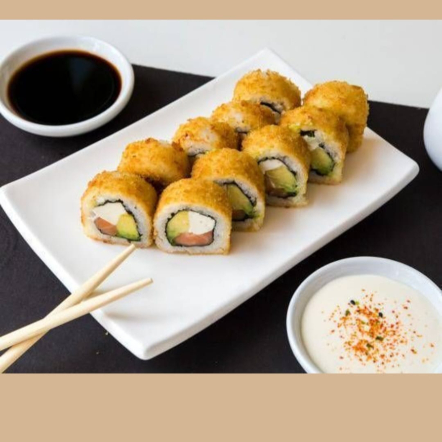 Ingredientes: arroz frito, camarón capeado, queso philadelphia, aguacate y pepino