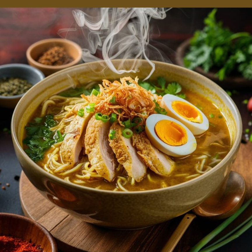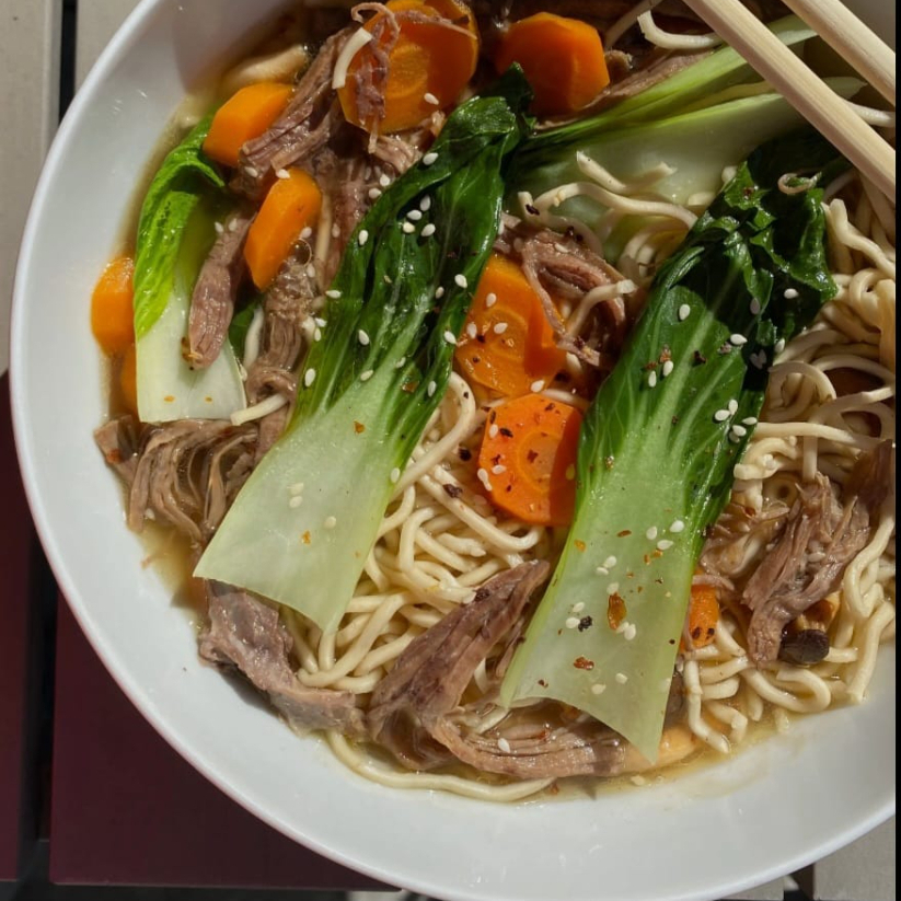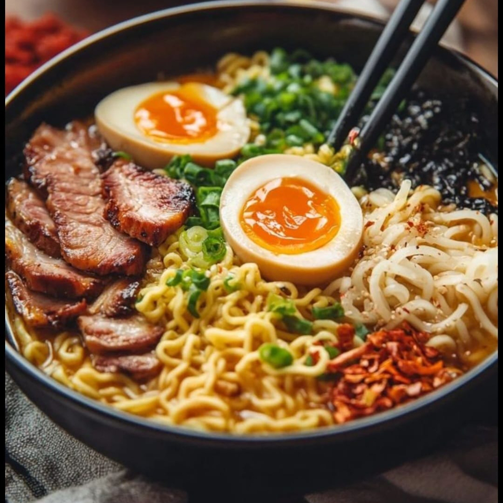Nuestro delicioso ramen muy bien servido con la carne de su elección, aguacate, elote, zanahoria, huevo escalfado, alga y naruto.