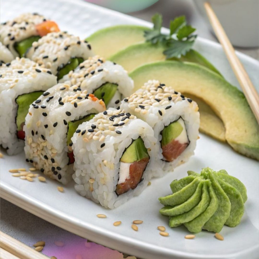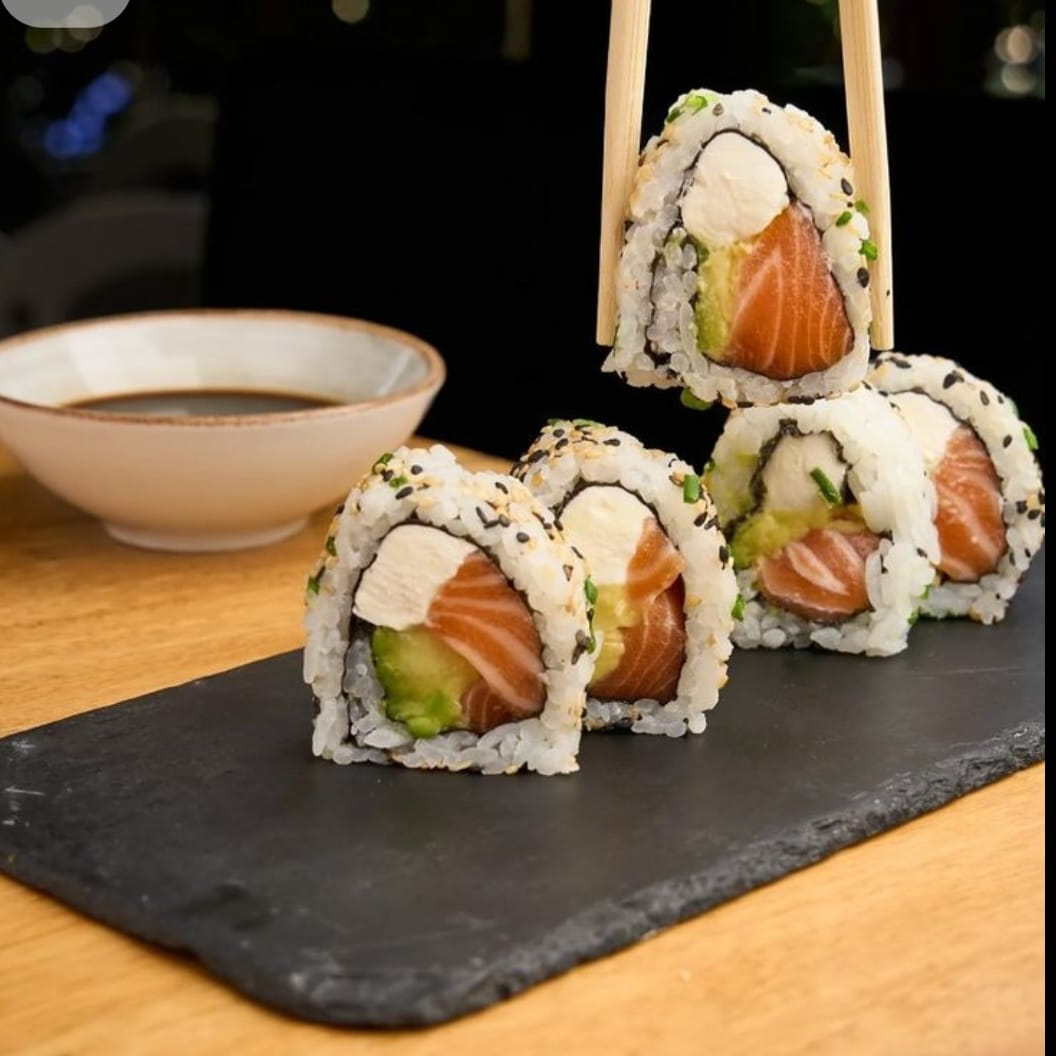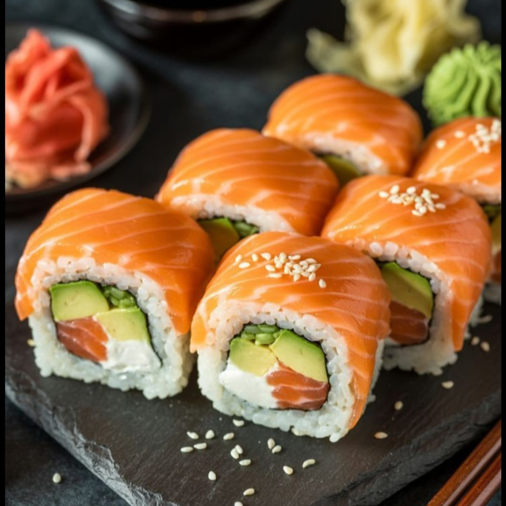 Ingredientes: (salmon, surimi, queso philadelphia, aguacate y pepino)