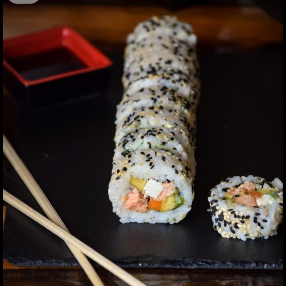 Ingredientes: salmón, cangrejo, queso philadelphia, aguacate y pepino.