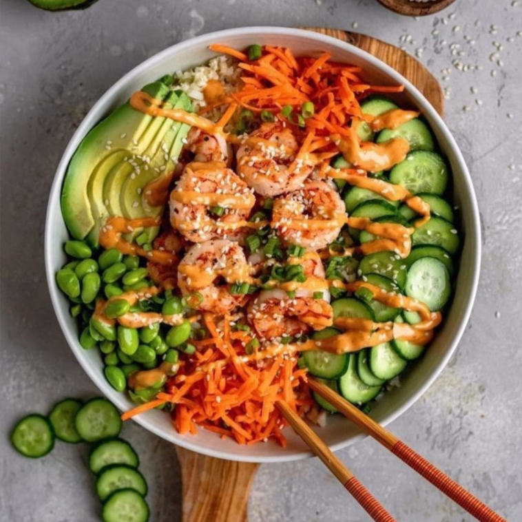 Ingredientes: camarón, queso philadelphia, aguacate y pepino