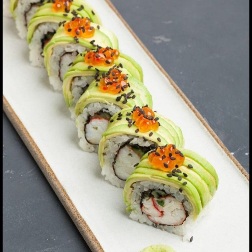 Ingredientes: masago, queso philadelphia, aguacate y pepino