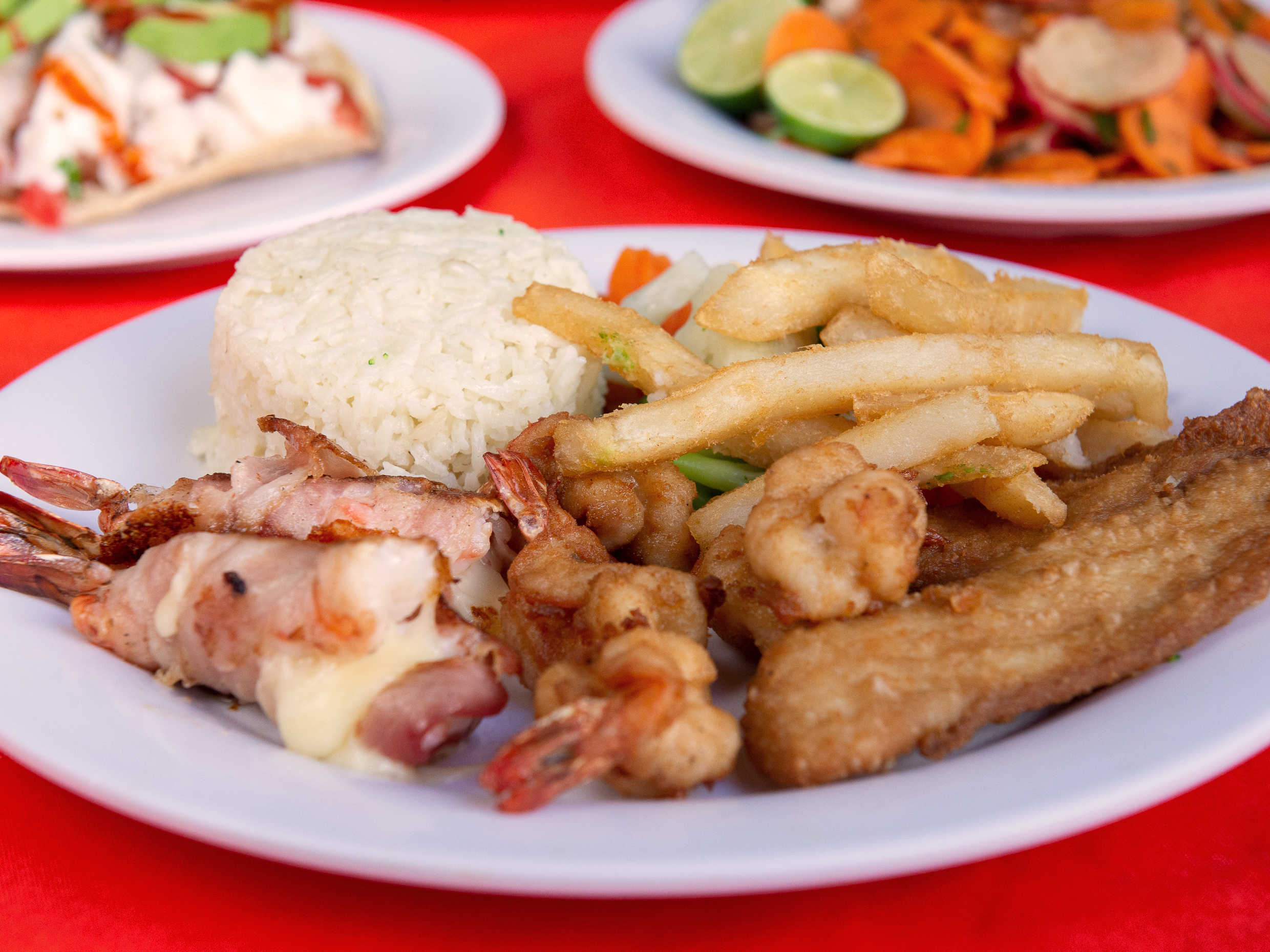 Filete de 2 pz acompañado con arroz blanco, verdura a vapor y papas a la francesa y una tostada de ceviche de pescado.