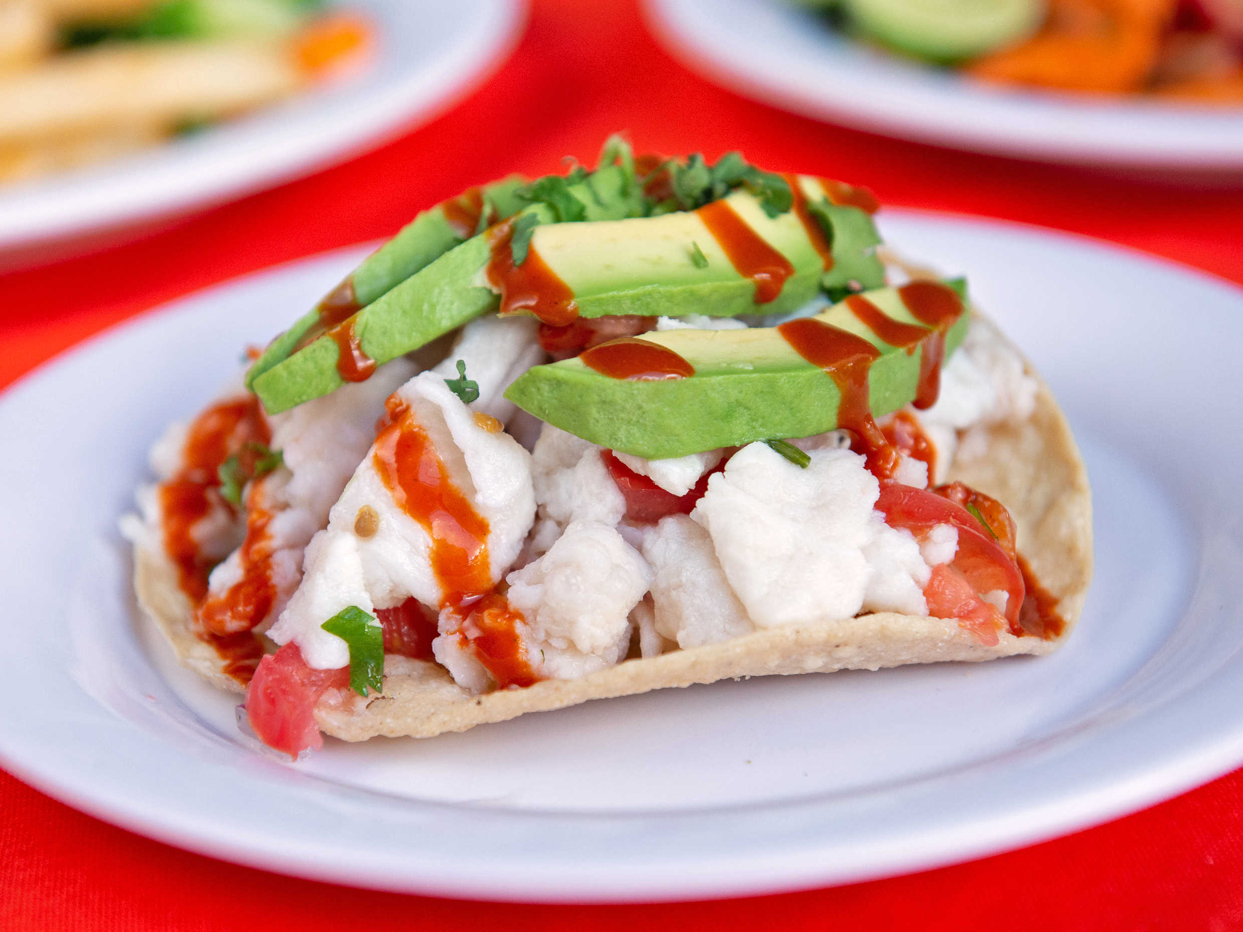 3 piezas de tacos de marlin guisado con pico de gallo, acompañados de lechuga, cebolla, tomate y aguacate