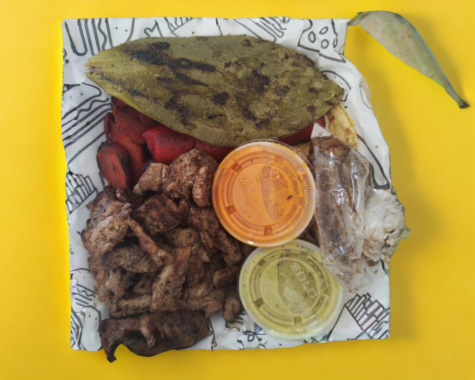 Incluye : Arrachera, 1 salchicha, 1 polaca, 1 nopal, salsa verde, salsa roja, cebolla preparada, tortillas, totopos