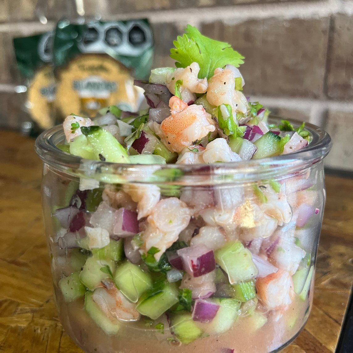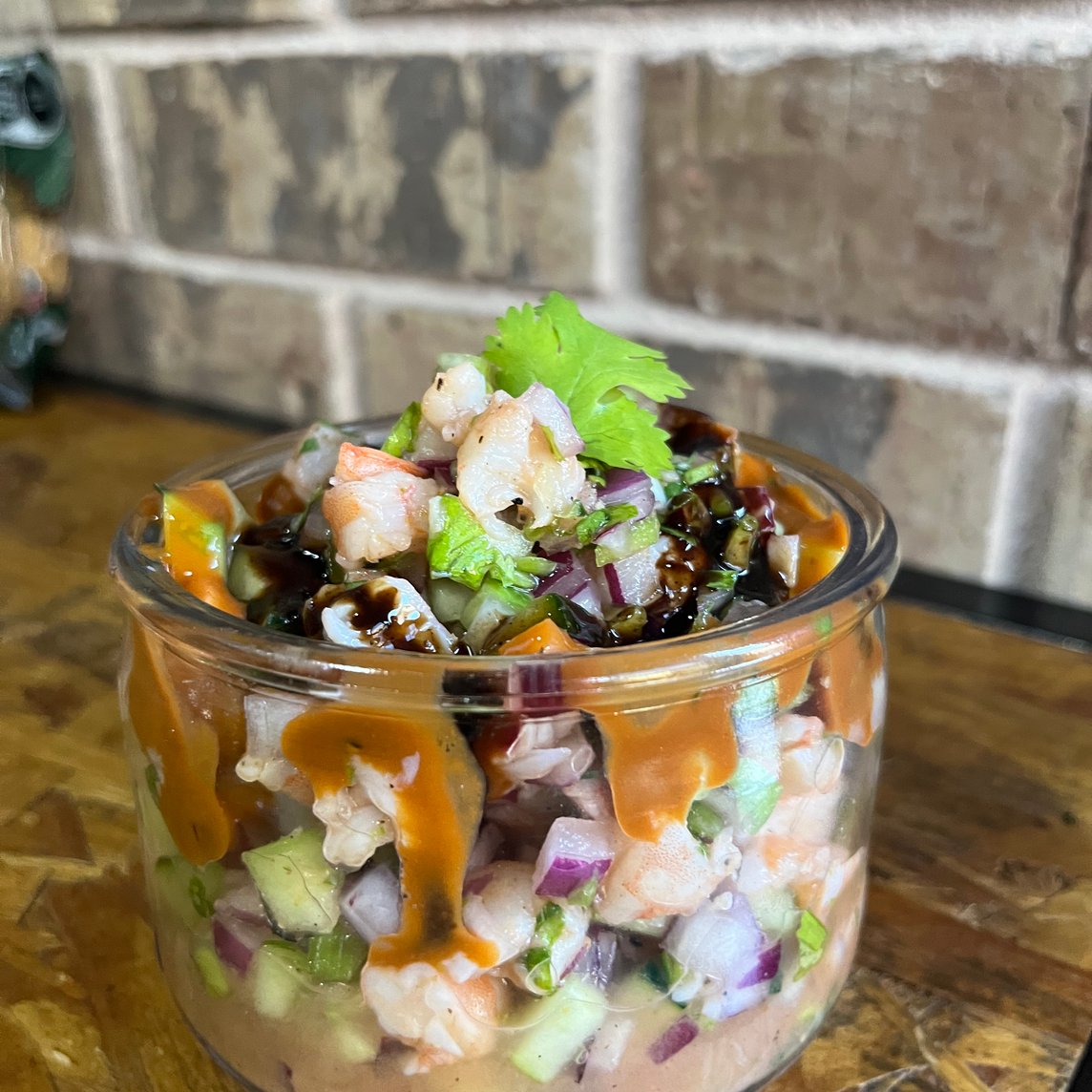 Medio litro de ceviche chingón de camarón con mucho sabor. Mezcla de verdura fresca, bañado con salsas chingonas de la casa.
