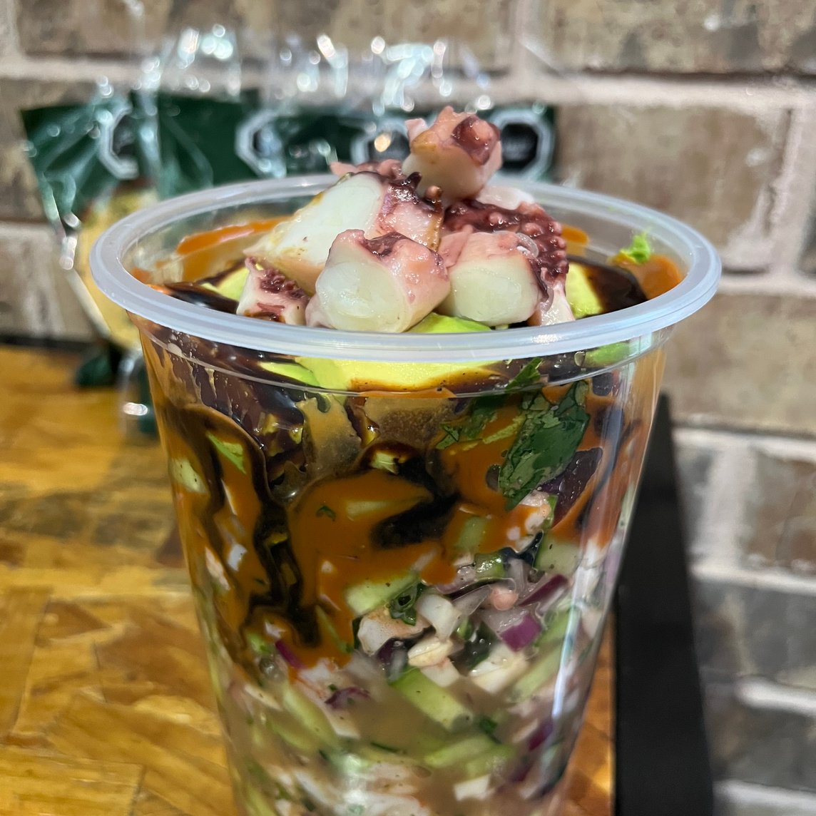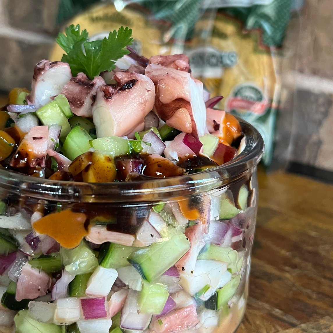 Medio litro de ceviche chingón de pulpo con mucho sabor. Mezcla de verdura fresca, bañado con salsas chingonas de la casa.