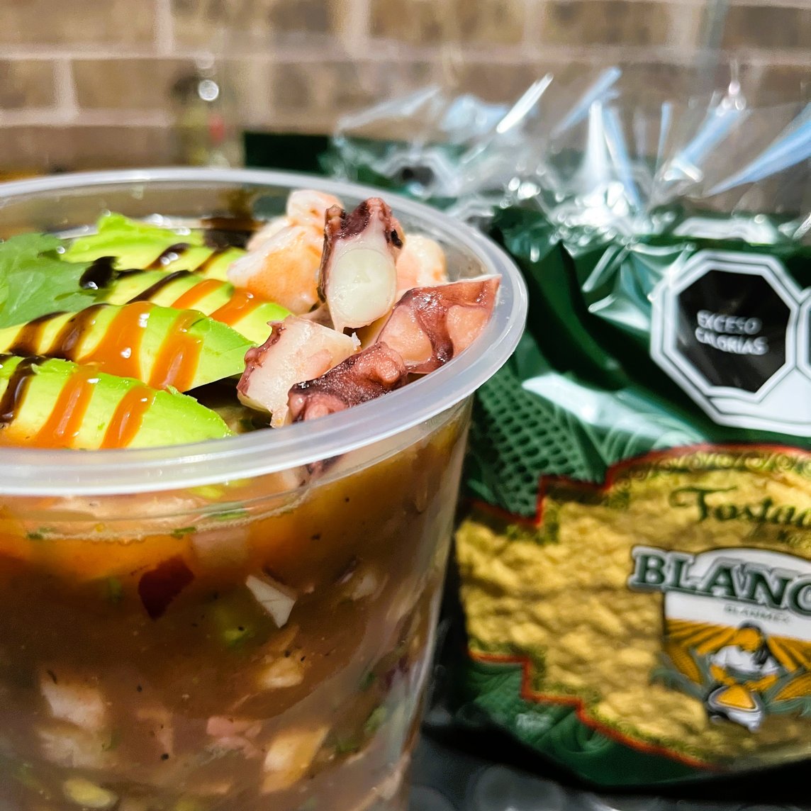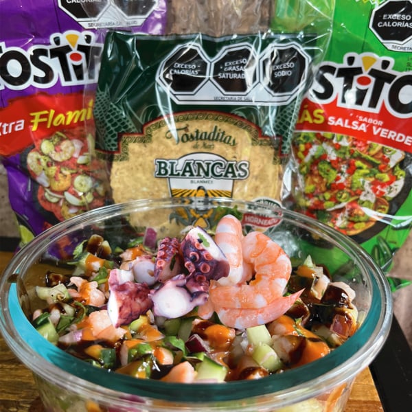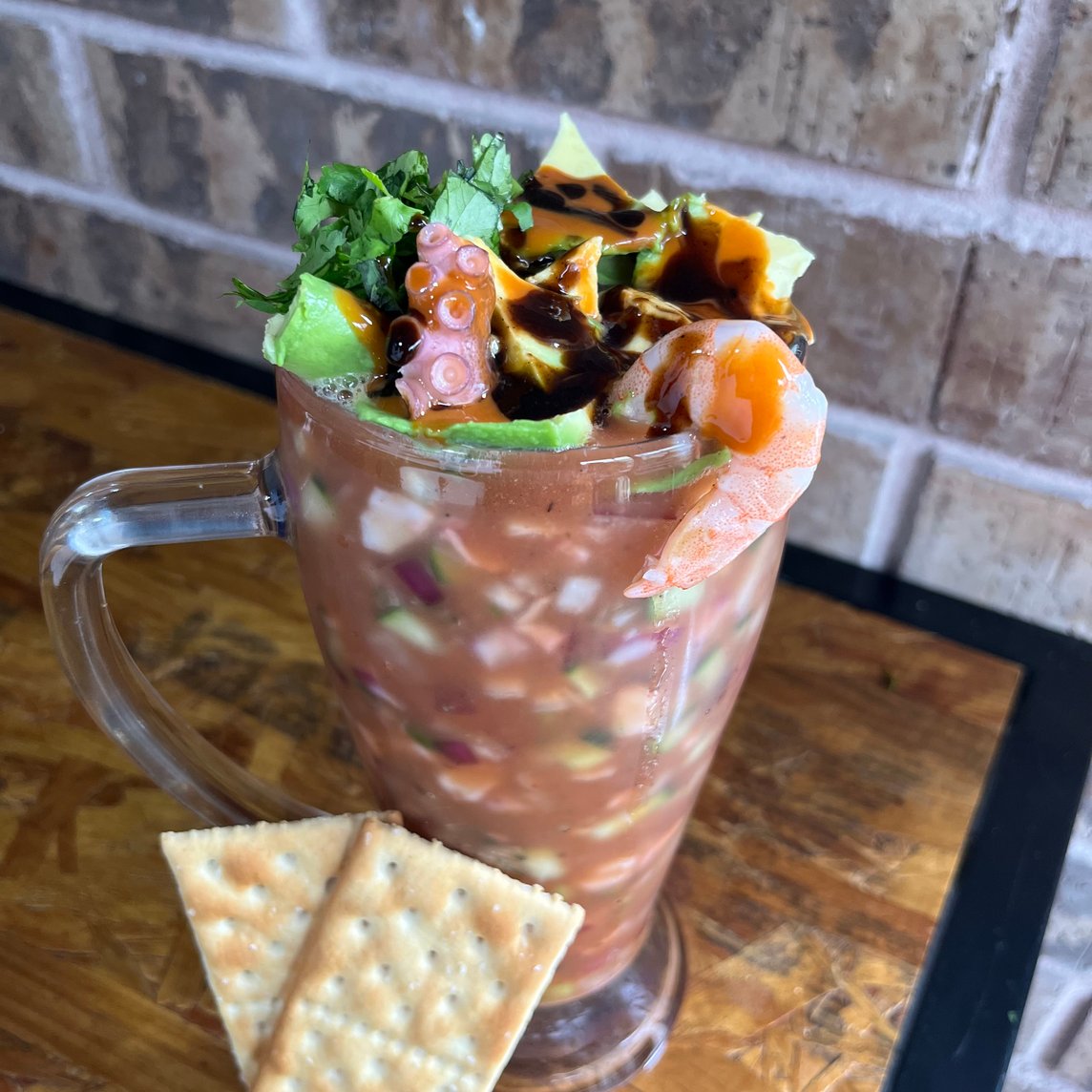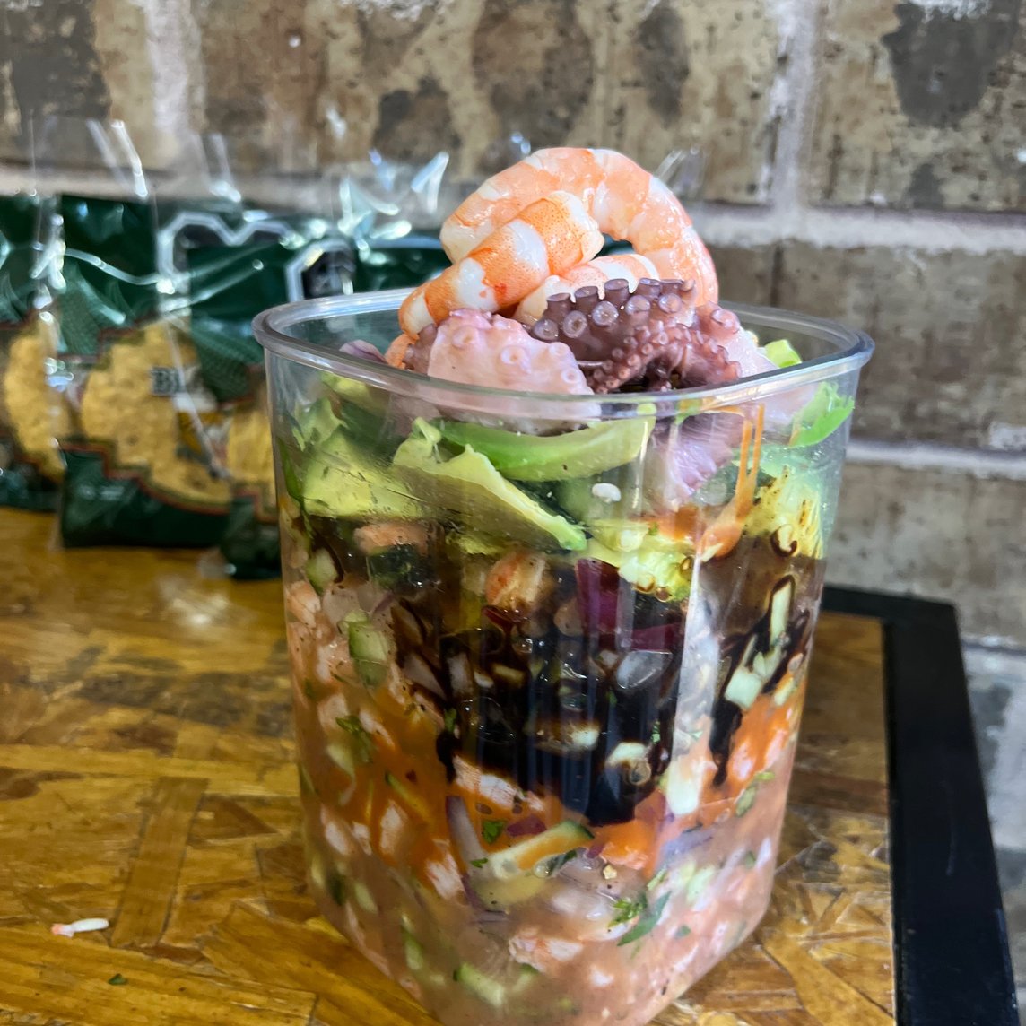 Coctél estilo pacífico, picosito, proteína y verdura fresca, agregamos caldo preparado y salsas de la casa, finalizamos con aguacate y mas salsa.