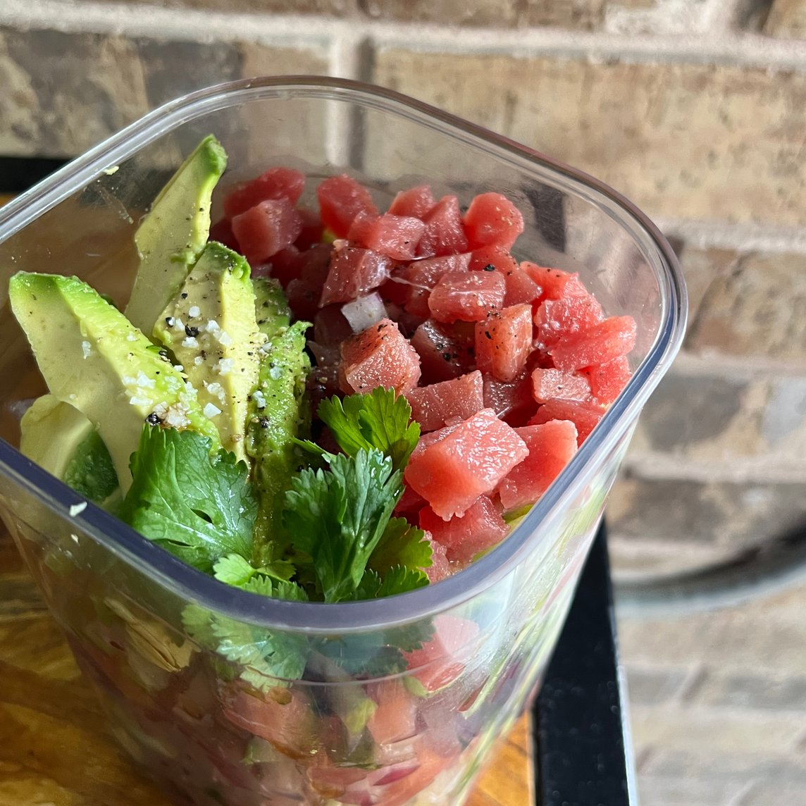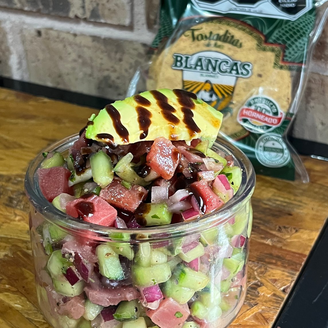 Medio litro de ceviche chingón de medallón de atún con mucho sabor. Mezcla de verdura fresca, bañado con salsas chingonas de la casa.