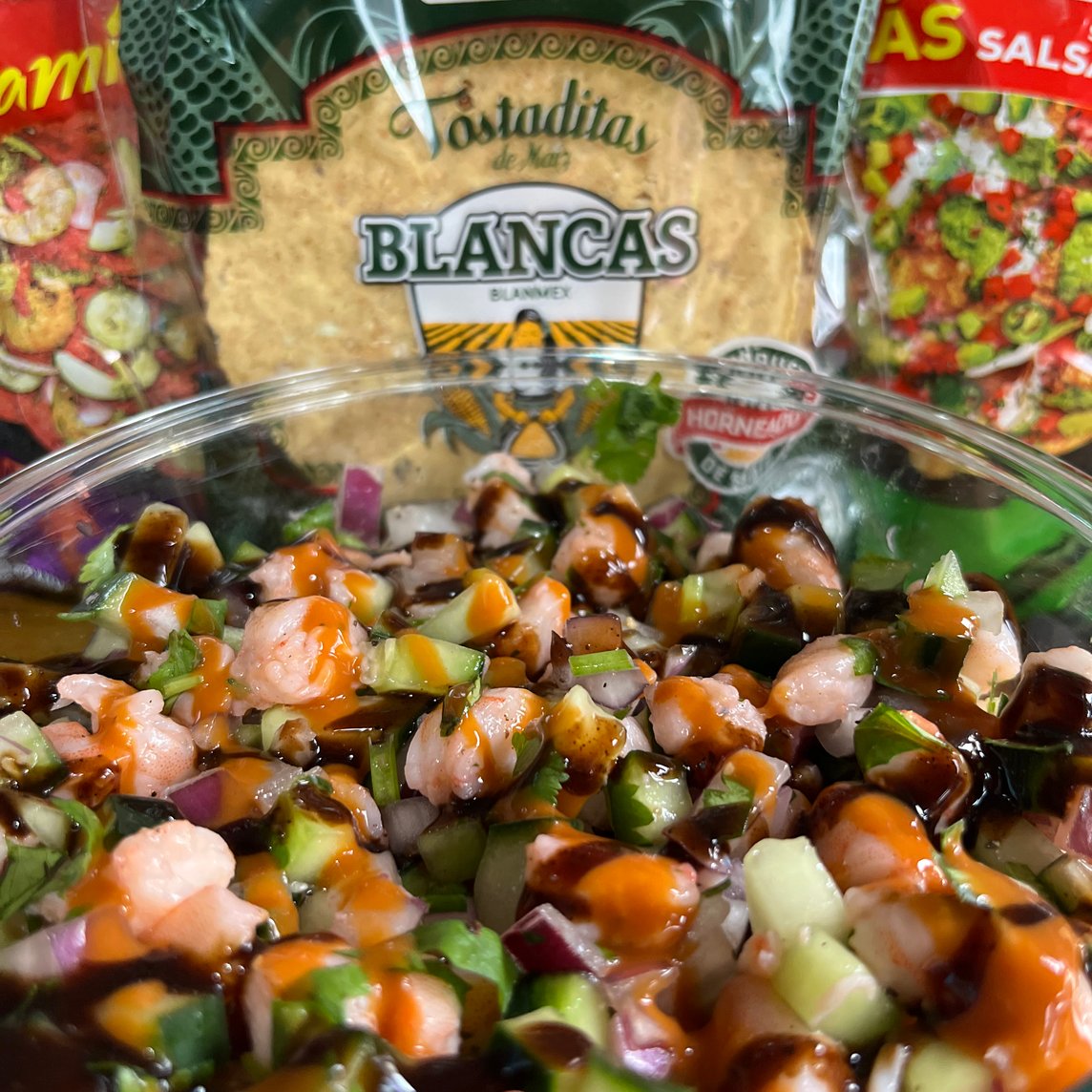 El mas vendido. camarón cocido y camarón curtido, mezclado con la salsa secreta de la casa, picoso y sabroso. Aguacate incluído.