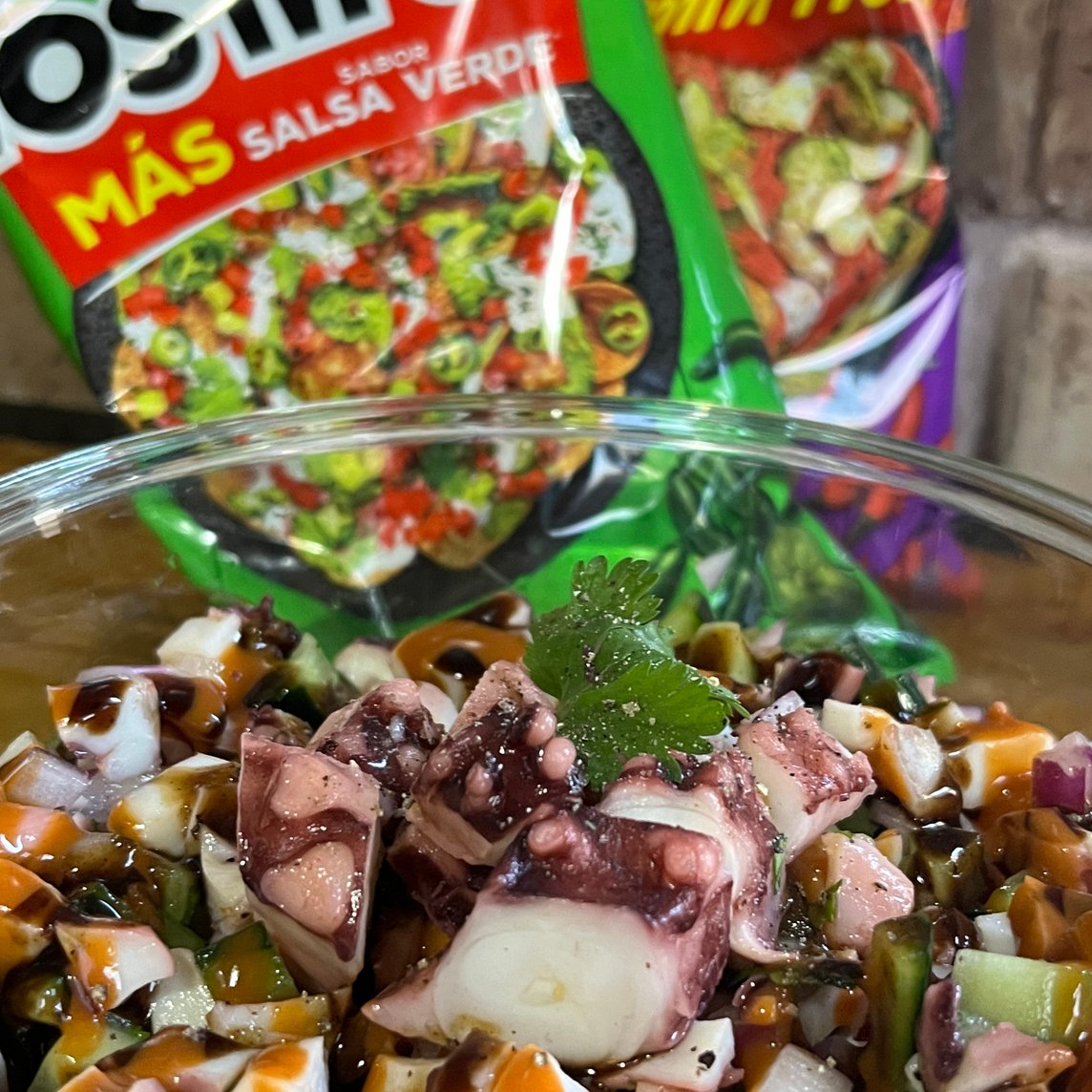 Ceviche chingón de pulpo para compartir con la familia o los compitas. Coronado con aguacate y bañado con nuestras salsitas chingonas.