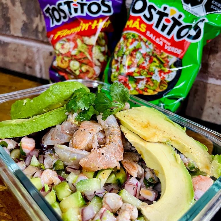 Ceviche chingón de camarón para compartir con la familia o los compitas. Coronado con aguacate y bañado con nuestras salsitas chingonas.