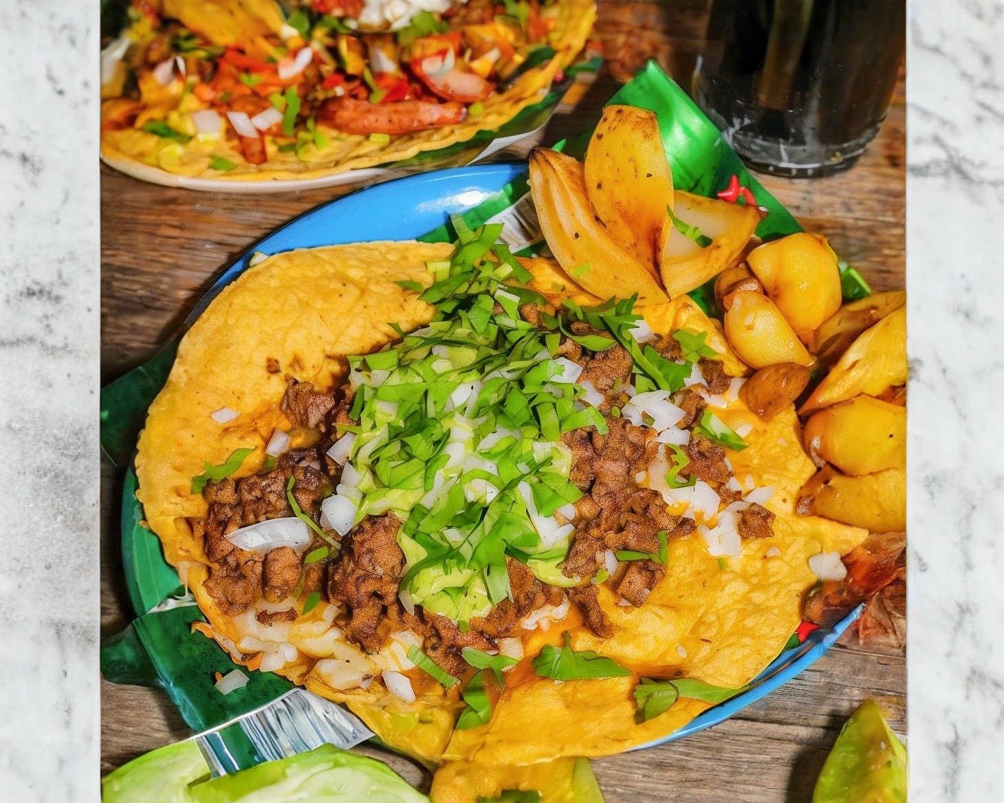 Tortilla grande de mais amarillo, queso mty jack, carne asada y pastor, acompañado de guacamole estilo tijuana, cebolla y cilantro picado. (incluye cebolla asada bañada en clamato y papa galeana adobada)