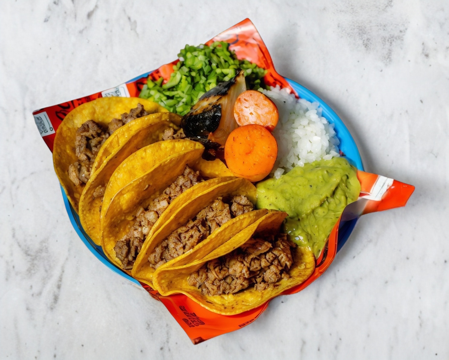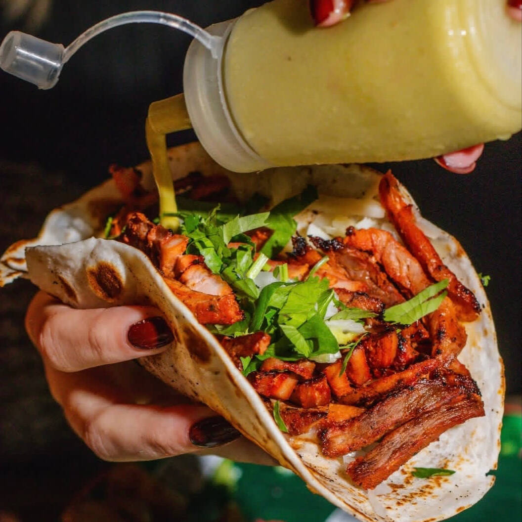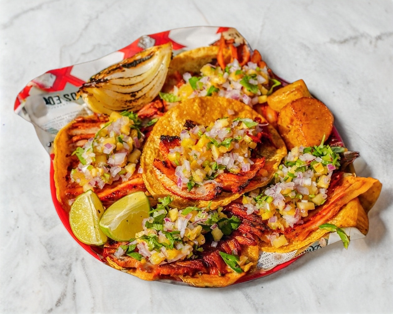 Doble tortilla de maíz amarillo, carne de pastor, acompado de cebolla y cilantro picado, guacamole estilo tijuana. (incluye cebolla asada bañada en clamato y papa galeana adobada)