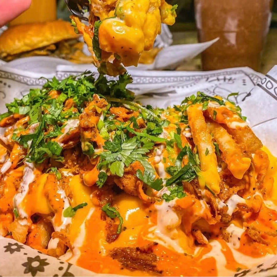 Una cama de papas a la francesa, bañadas en salsa de queso con macarrones, pollo frito, cebolla frita, cilantro picado, salsa buffalo y ranch.