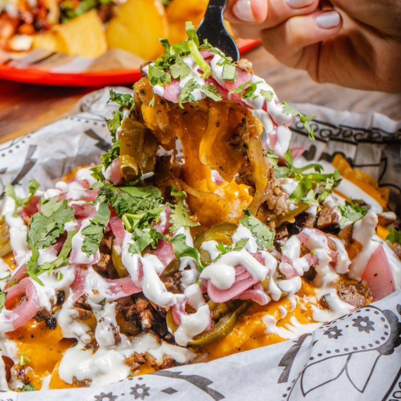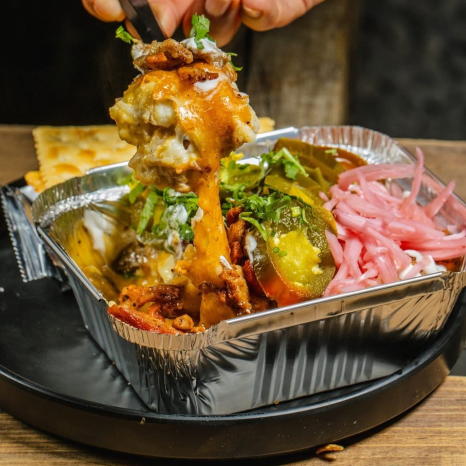 Una cama de papas a la francesa, bañadas en salsa de queso, totopos, carne asada, chiles en escabeche, crema acida, cebolla morada encurtida y cilantro picado.